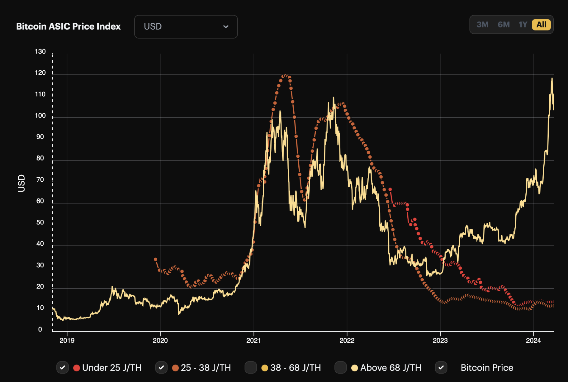• ASIC demand is not entirely correlated with the Bitcoin price; it is also influenced by inventory levels of new and used machines, mining farm availability, and miner cash balances.