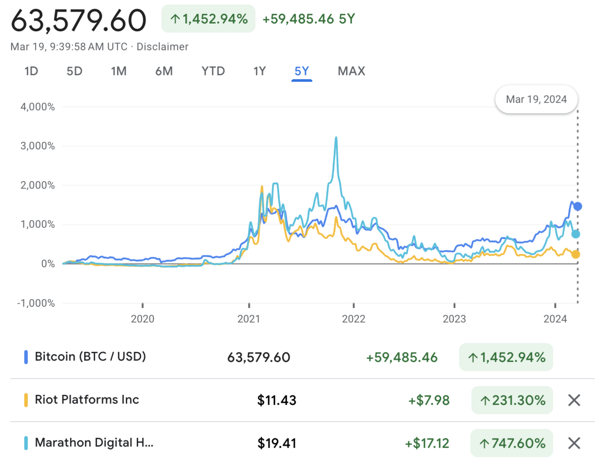 Investors choose Bitcoin mining stocks because they have operational leverage on the Bitcoin price due to relatively fixed costs for power. As the Bitcoin price increases, so do miner margins.
