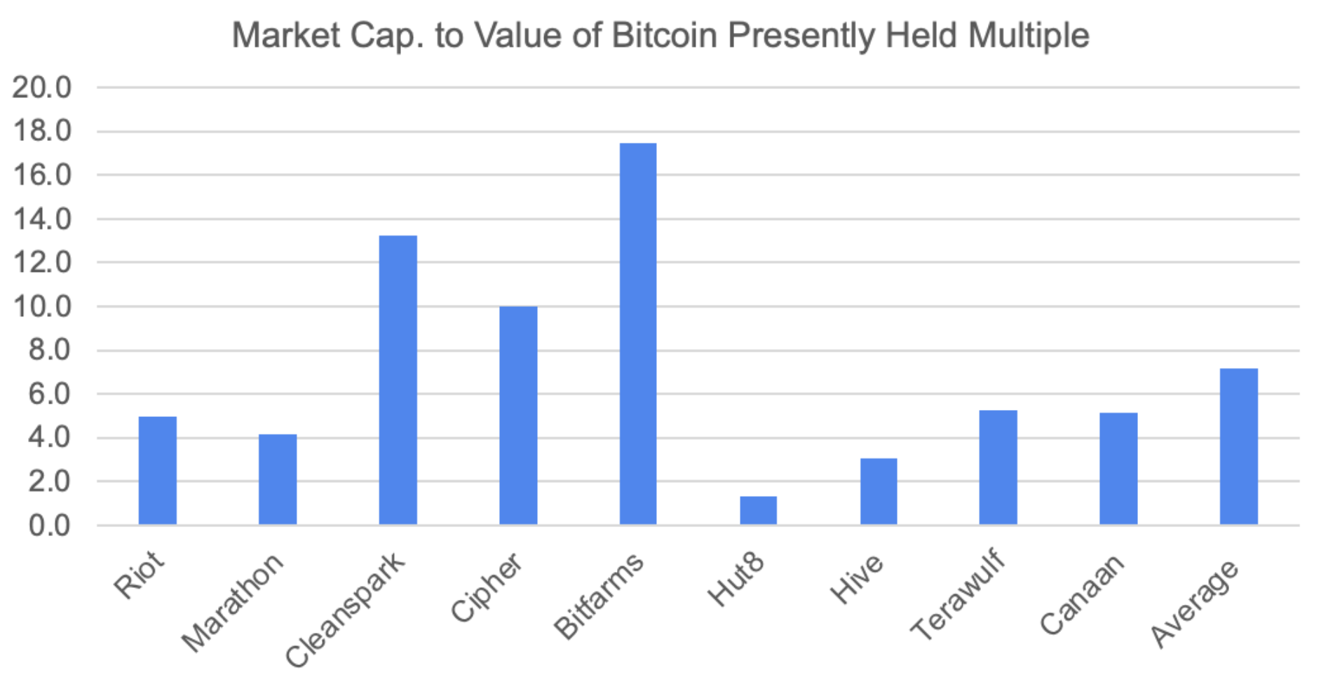 The average miner is valued at 7.2X the value of it’s Bitcoin holdings, but there are serious divergences and the multiple will probably contract in the future.