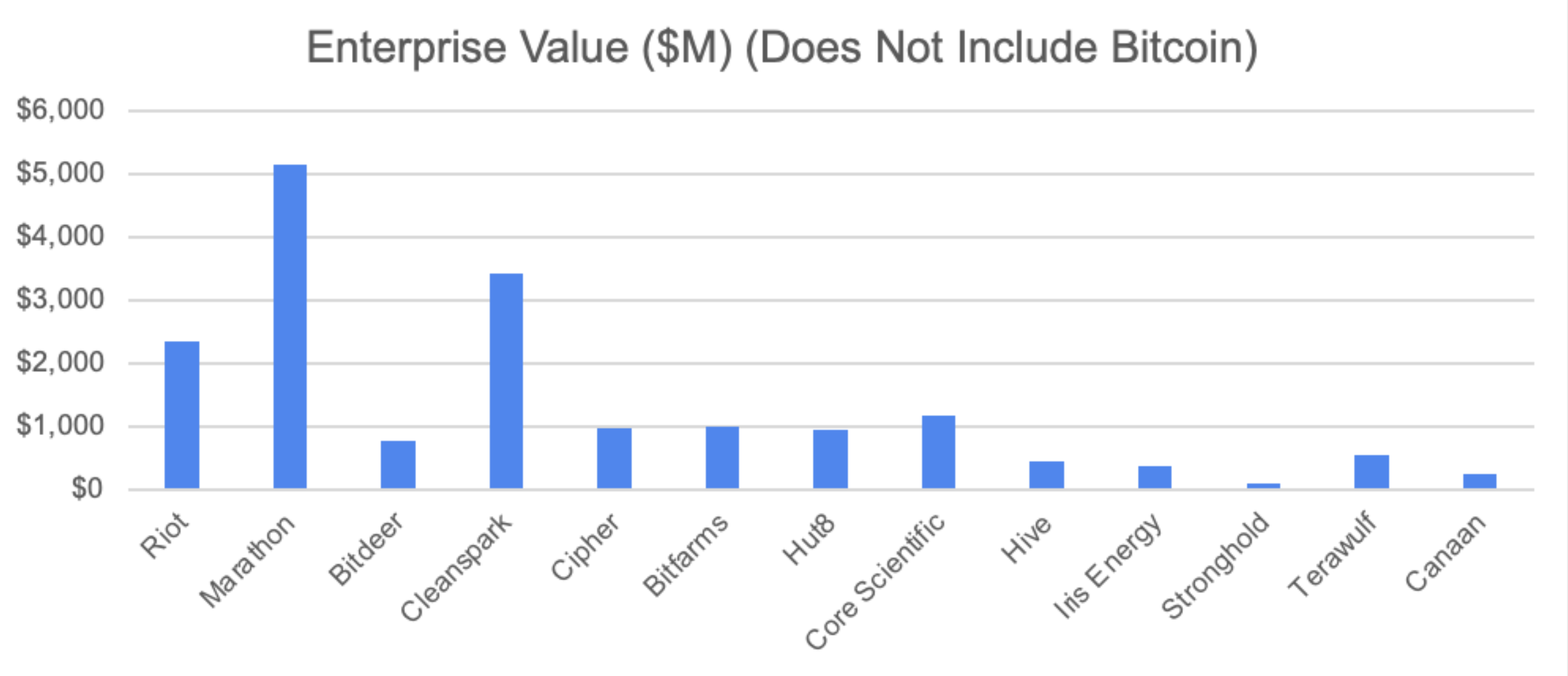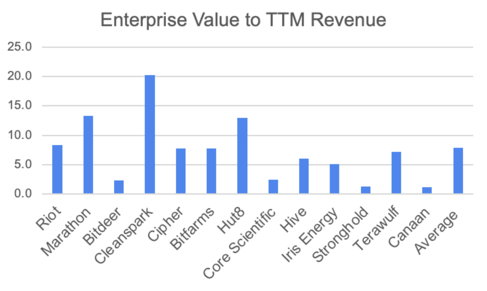 Miners that engage in hosting and cloud mining have these operations valued lower by the markets. Pure play proprietary miners (Riot & Marathon, & Cleanspark) continue to enjoy valuation premiums.