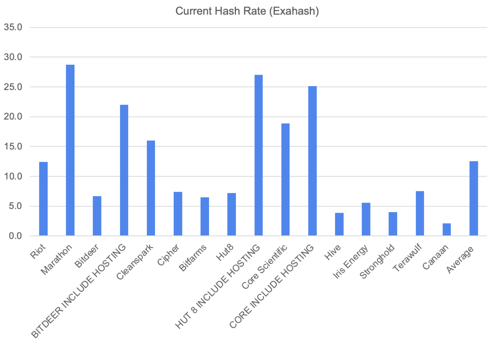 Marathon, Bitdeer, Hut 8, and Core have the highest capacity, but with the exception of Marathon they have large hosting businesses and in Bitdeer’s case, cloud mining operations. Core recently emerged from bankruptcy.