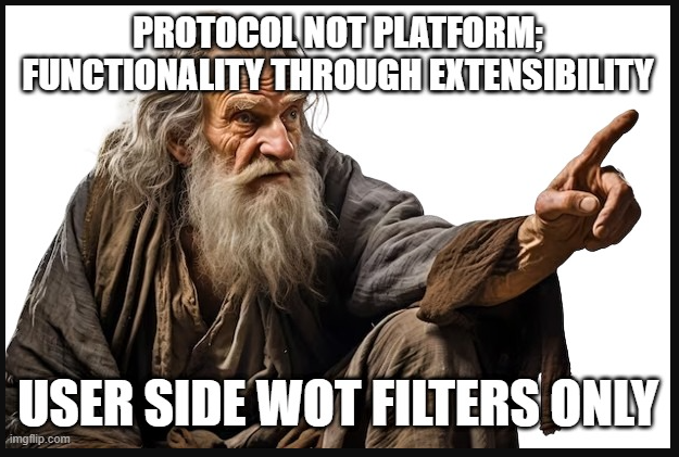 Lately I've happily heard more chatter on #nostr about "Web of Trust." In case anyone is unaware, a Web of Trust is essentially a reputation score. In my mind, it'd be a number, say 0 to 100, that would be displayed aside one's Nostr avatar. The number would signal to others your "Nostr rep" in a glance.