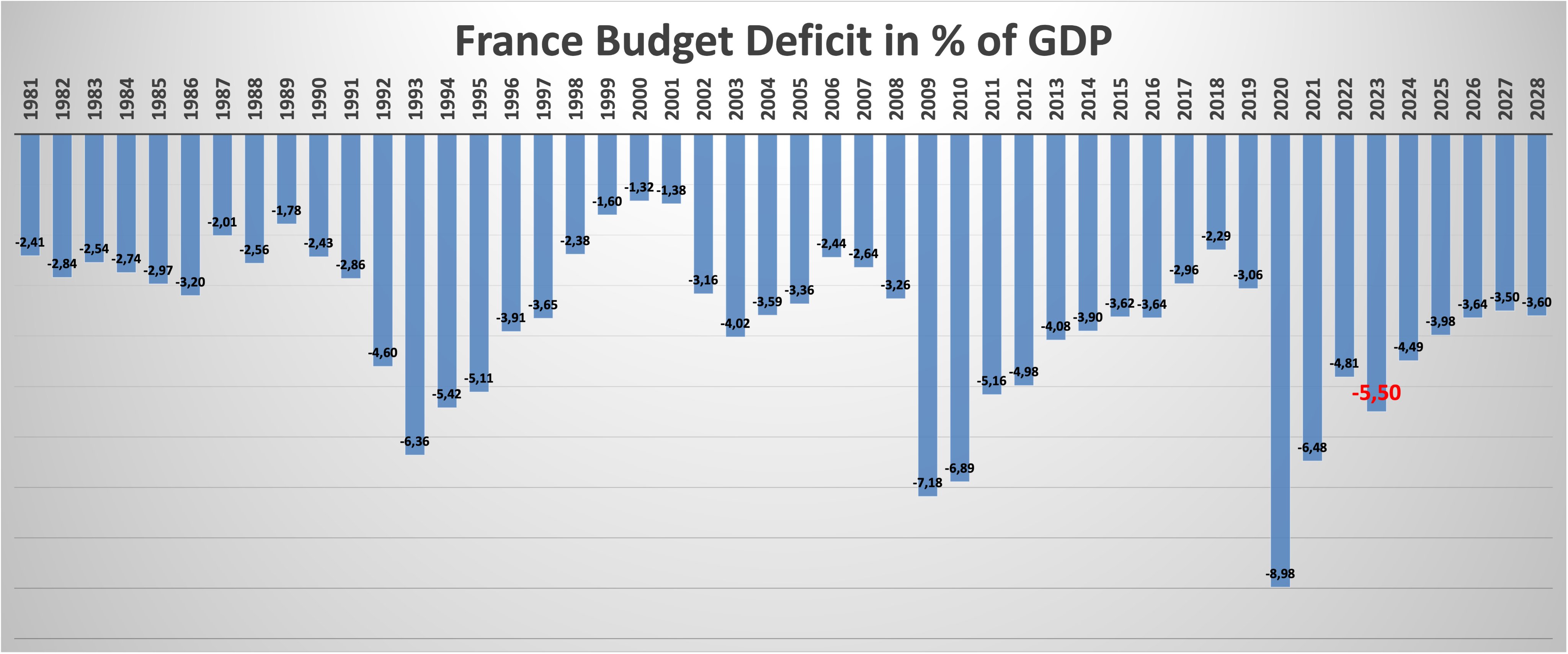 In France, for instance, the public deficit for 2023 widened to 5.5% of GDP, up from 4.8% in 2022, surpassing the government's target of 4.9%. It's evident that the current year's projections will likely fall short of reality.