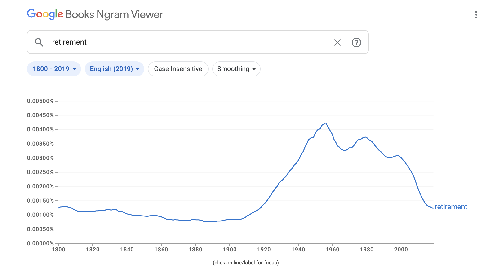 today i used google ngram to see how frequently the word “retirement” was published in english language books over the last 200 years.