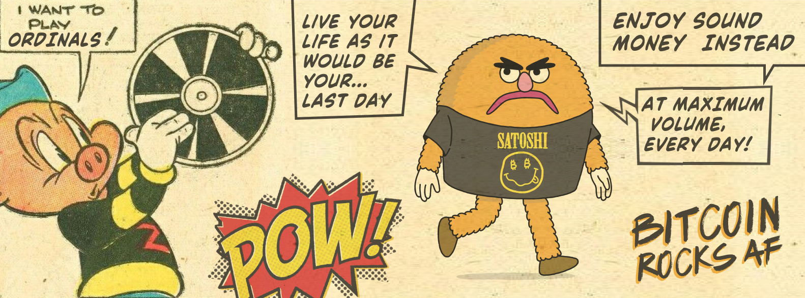 Starting from this sticker, design a comic frame or a meme, add a message that perfectly captures the sentiment of the current most hilarious take on the Bitcoin space. You can contextualize it or not, it's up to you, you chose the message, the context and anything else that will help you submit your comic art masterpiece.