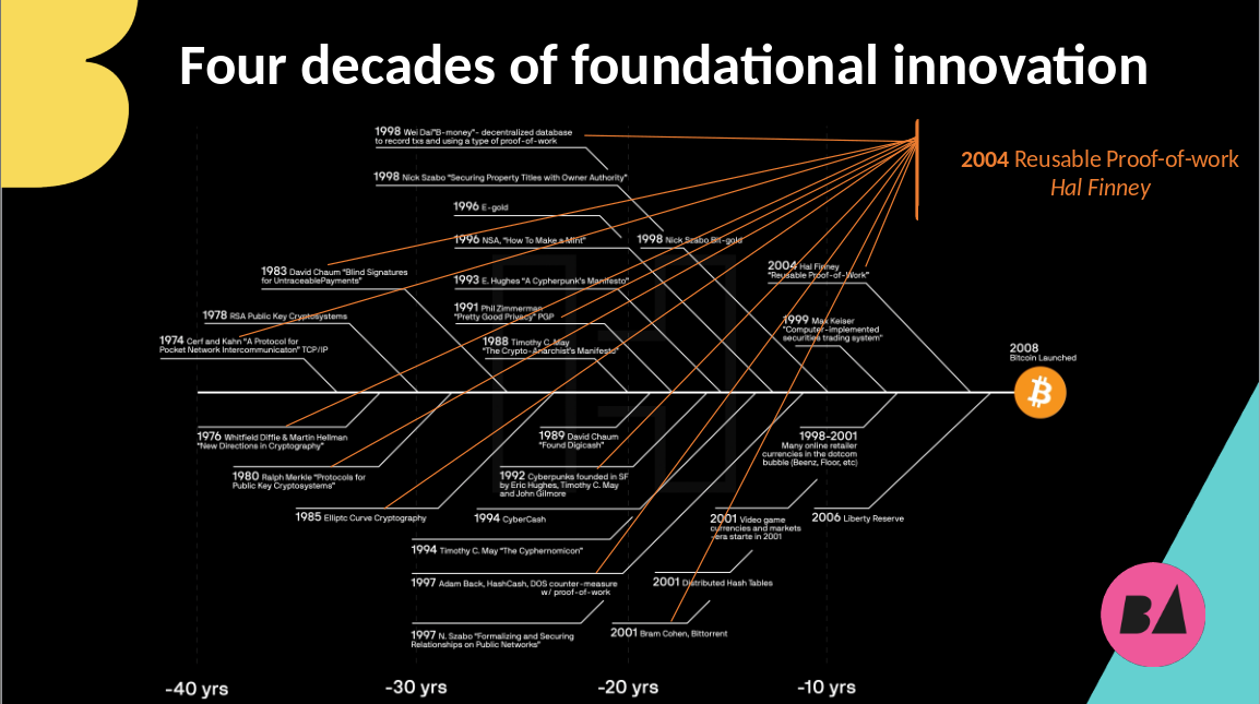 Bitcoin did not come out of nowhere, it was the capstone on DECADES of innovation.