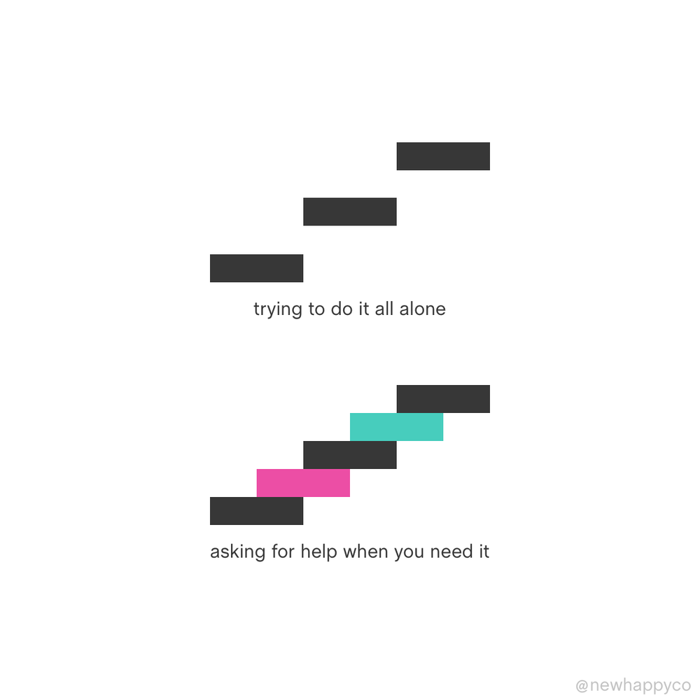 Old Happy’s culture of individualism tells you that you need to do everything in your life on your own, all by yourself, and if you can’t, then you are broken, flawed, and unworthy. It’s no wonder that so many people struggle to ask for help — from a very early age, we are taught to avoid it at all costs.