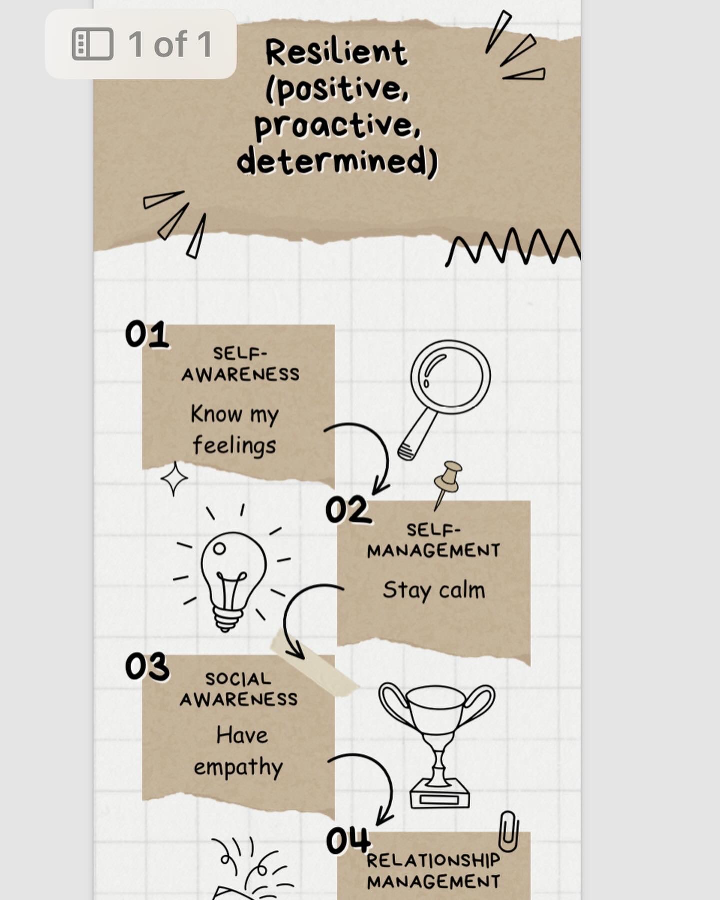 This book is clearly divided into 4 sections: self-awareness, self-management, social awareness & relationship management. It’s a systematic way of covering intrapersonal & interpersonal skills, and you can see how I shamelessly applied these sections in a poster I designed to teach my students about resilience. (Aside: I got sick and tired of NorthLight students telling me “Never Give Up” all the time. What does it mean to “never give up” anyway?)
