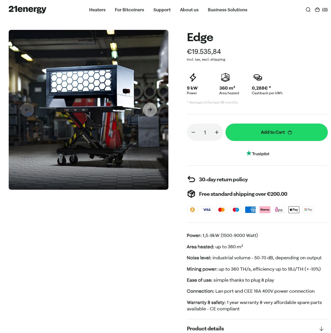 - In the end of writing this post, I found on the website of 21energy this wonderful device. With the parameters given, we have 360 TH with up to 9 KW power for around 20,000 €. In my opinion, prices could fall significantly when there is a higher demand for these devices and they leave the prototyping stage (which seems still to be the case for me).