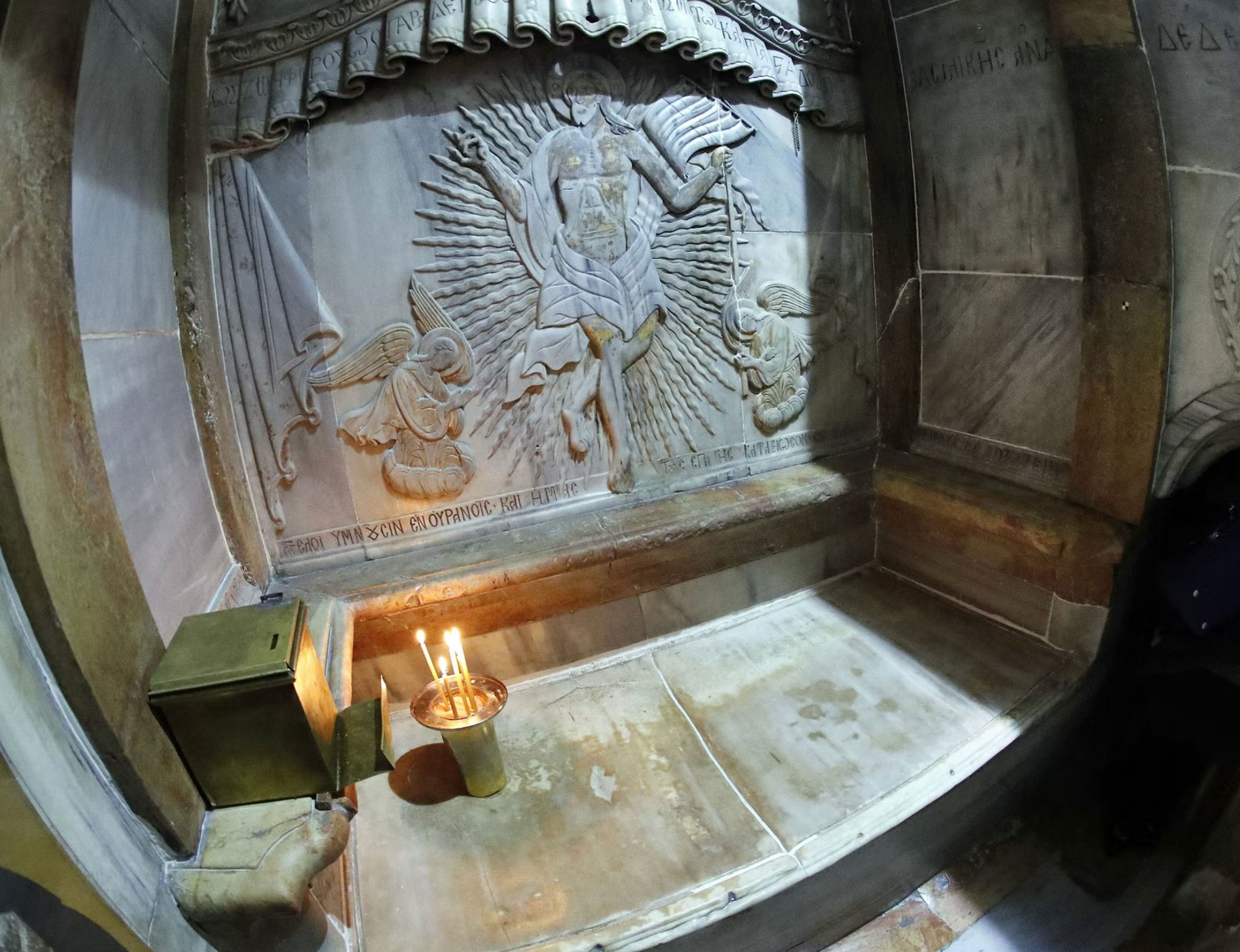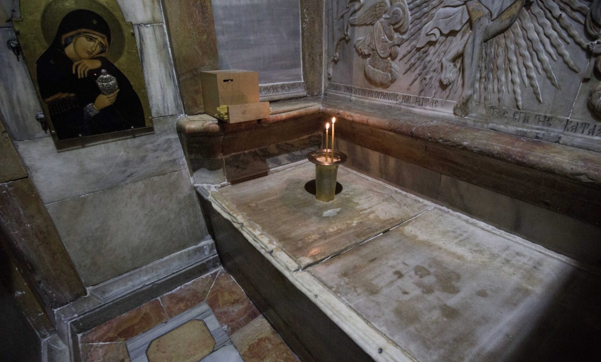 The tomb looks like this. It's inside a shrine called the Edicule, in Jerusalem's Church of the Holy Sepulchre.