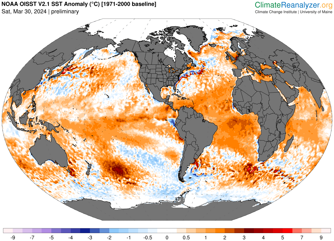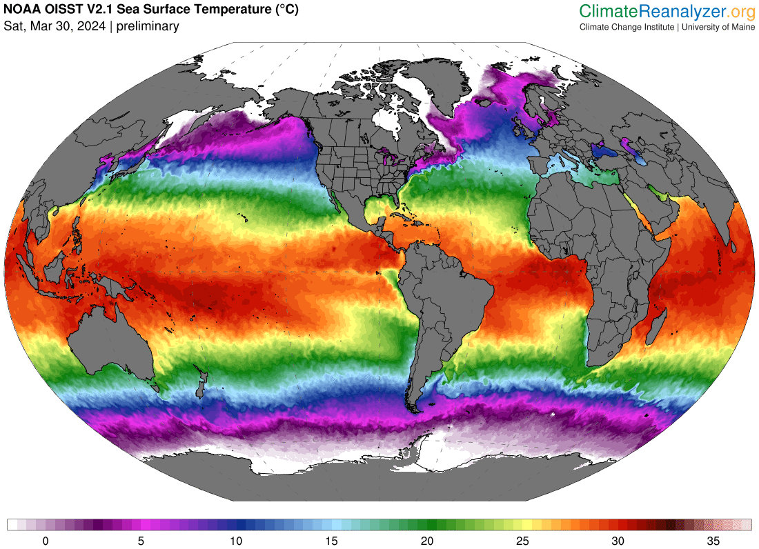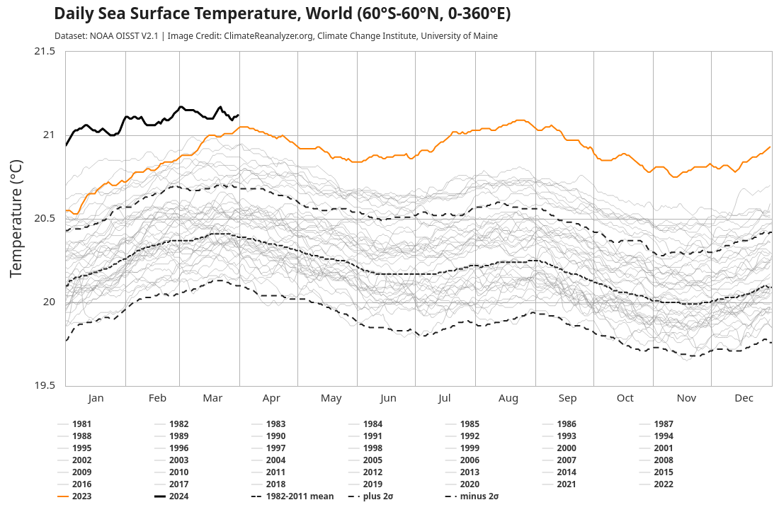 I see the global sea temperature is getting stabilized a bit on March, but still at record levels all year. See 2023 (orange line) and current 2024 year (black line). The anomaly is getting larger quicker than expected.