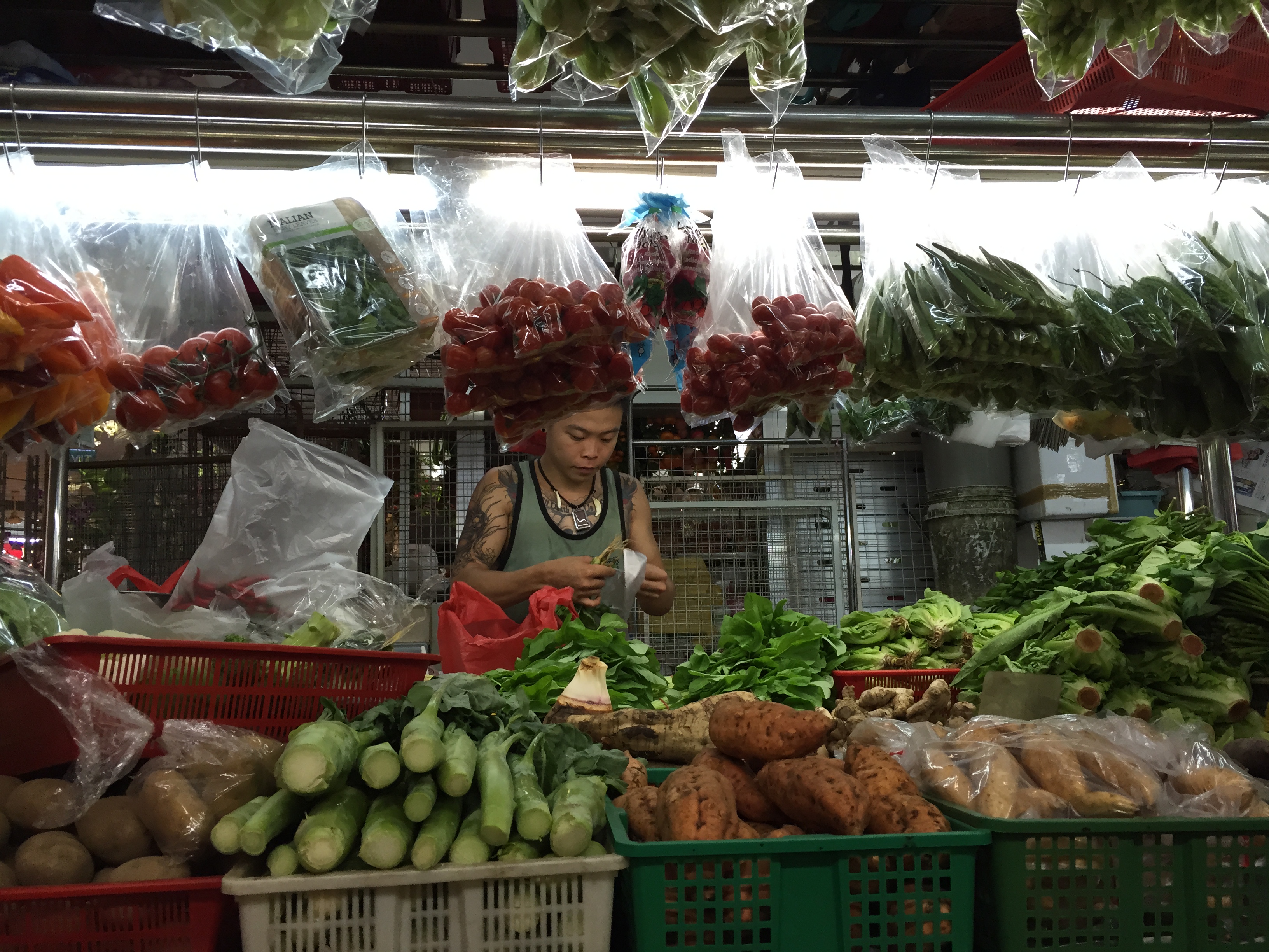 Vegetables placed in plastic bags at the top of the stall in Singapore