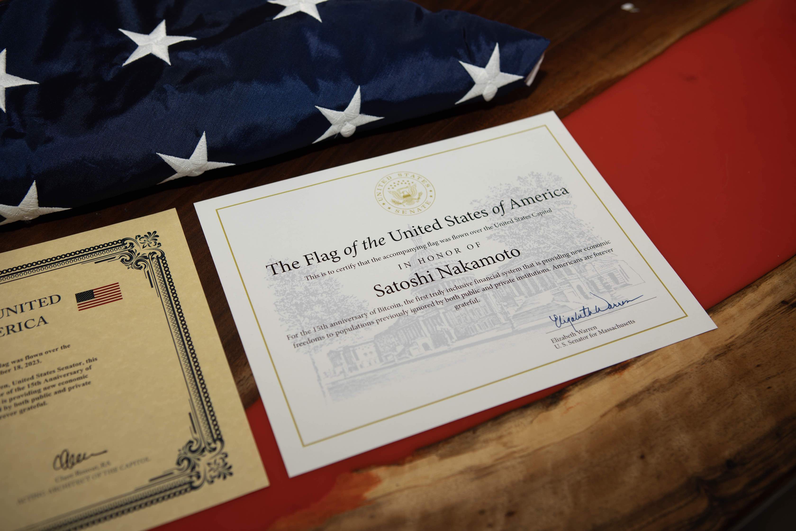 We also hosted an event with the Human Rights Foundation and CATO in February of this year to discuss their global CBDC Tracker website, during which we revealed that we were in possession of an American Flag that had been flown over the U.S. Capitol on December 18, 2023 for the 10th anniversary of the "I AM HODLING" meme. It was accompanied by an official certificate with Senator Elizabeth Warren's signature honoring Satoshi Nakamoto for providing economic freedoms to Americans.