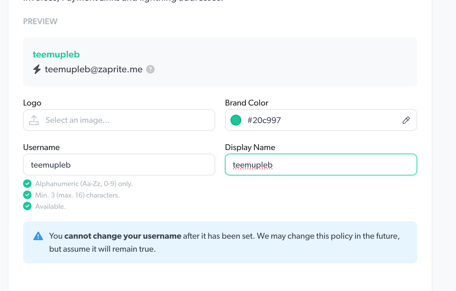 You can add a logo for your business, brand colors and set a username which will eventually become your Lightning address (not operational as of now in April 2024).
