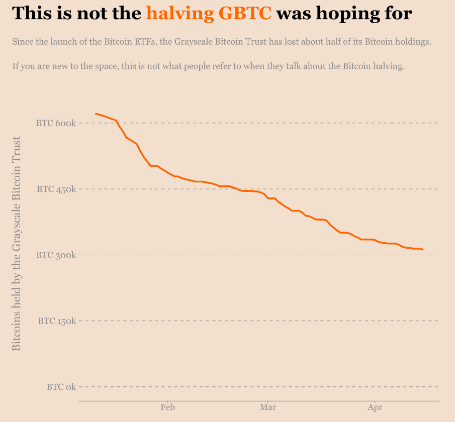 Meanwhile, the Grayscale Bitcoin Trust's recent halving, losing 300k BTC since the launch of spot Bitcoin ETFs, may have a more immediate negative impact on Bitcoin's price.