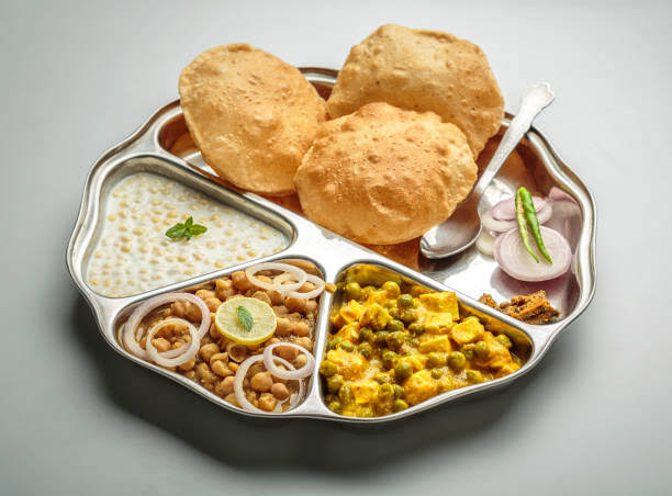 Poori with Chole and matar paneer and raita with pickle is the best morning food in north India and you'll find a lot of small roadside hawkers serving this food and people eating with love.