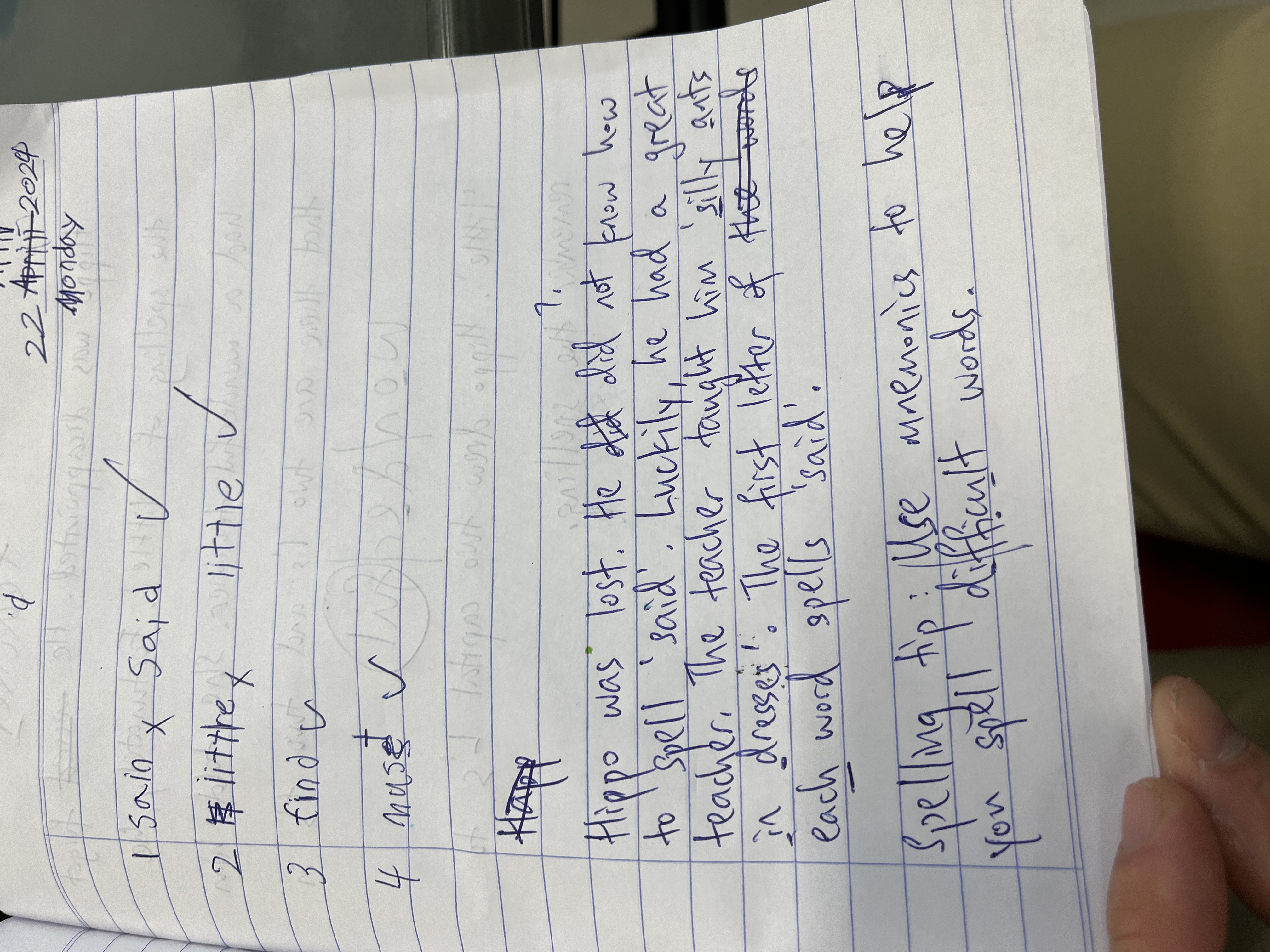 Even though he remembers the mnemonic silly ants in dresses, he was unable to use it to spell said correctly. I realised it was because he wasn’t familiar with dresses in the first place! Hence, the mnemonic wouldn’t be totally effective for him.