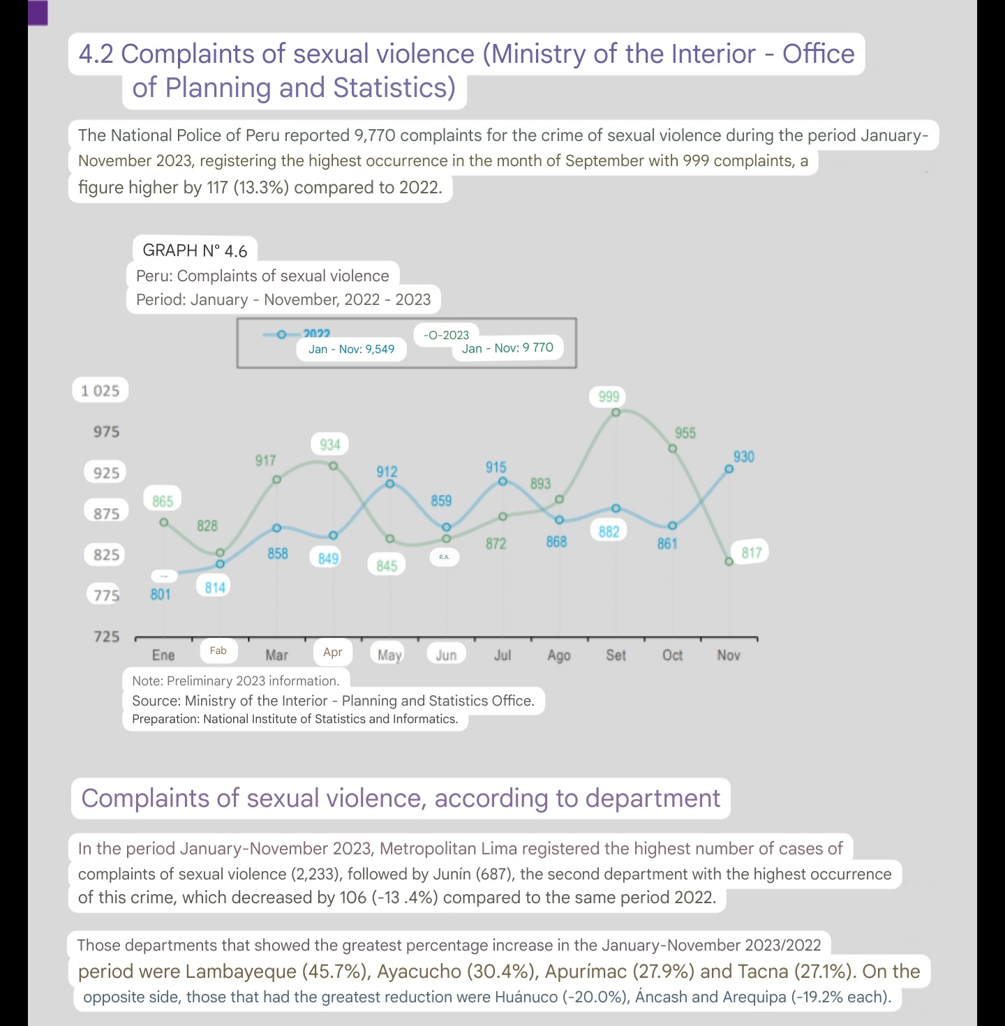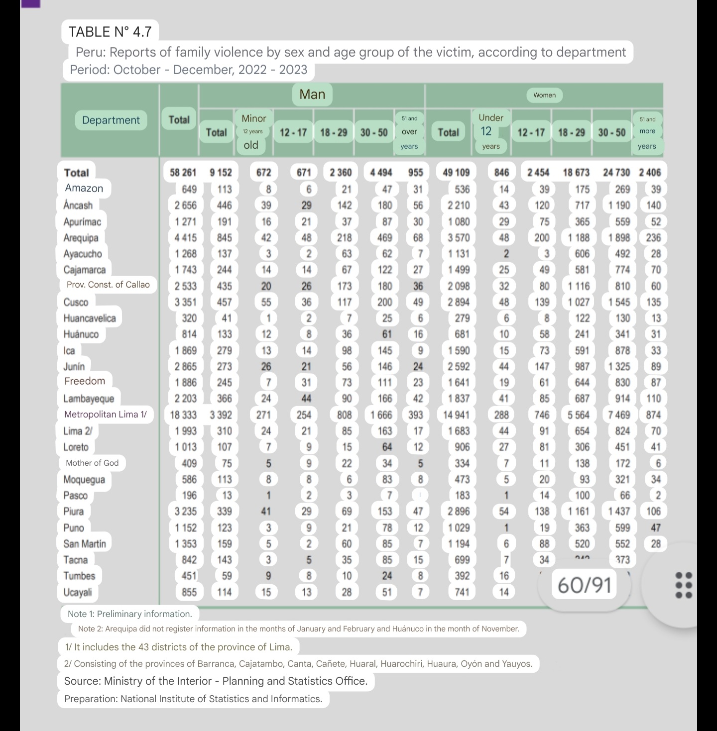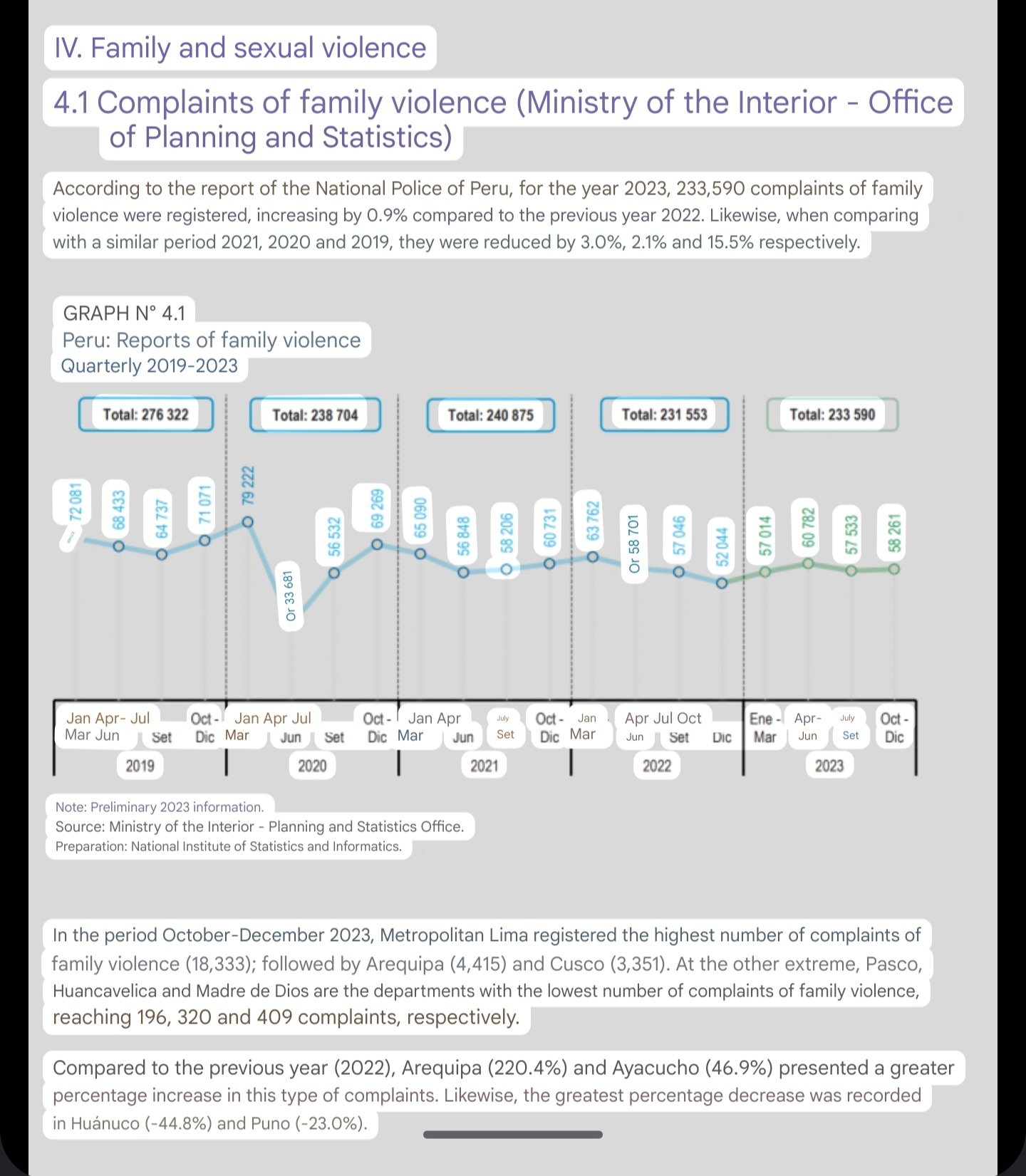 Below I will leave the statistics on family and sexual violence and white trafficking. Reference: https://m.inei.gob.pe/biblioteca-virtual/boletines/estadisticas-de-seguro-ciudadana/1/#lista