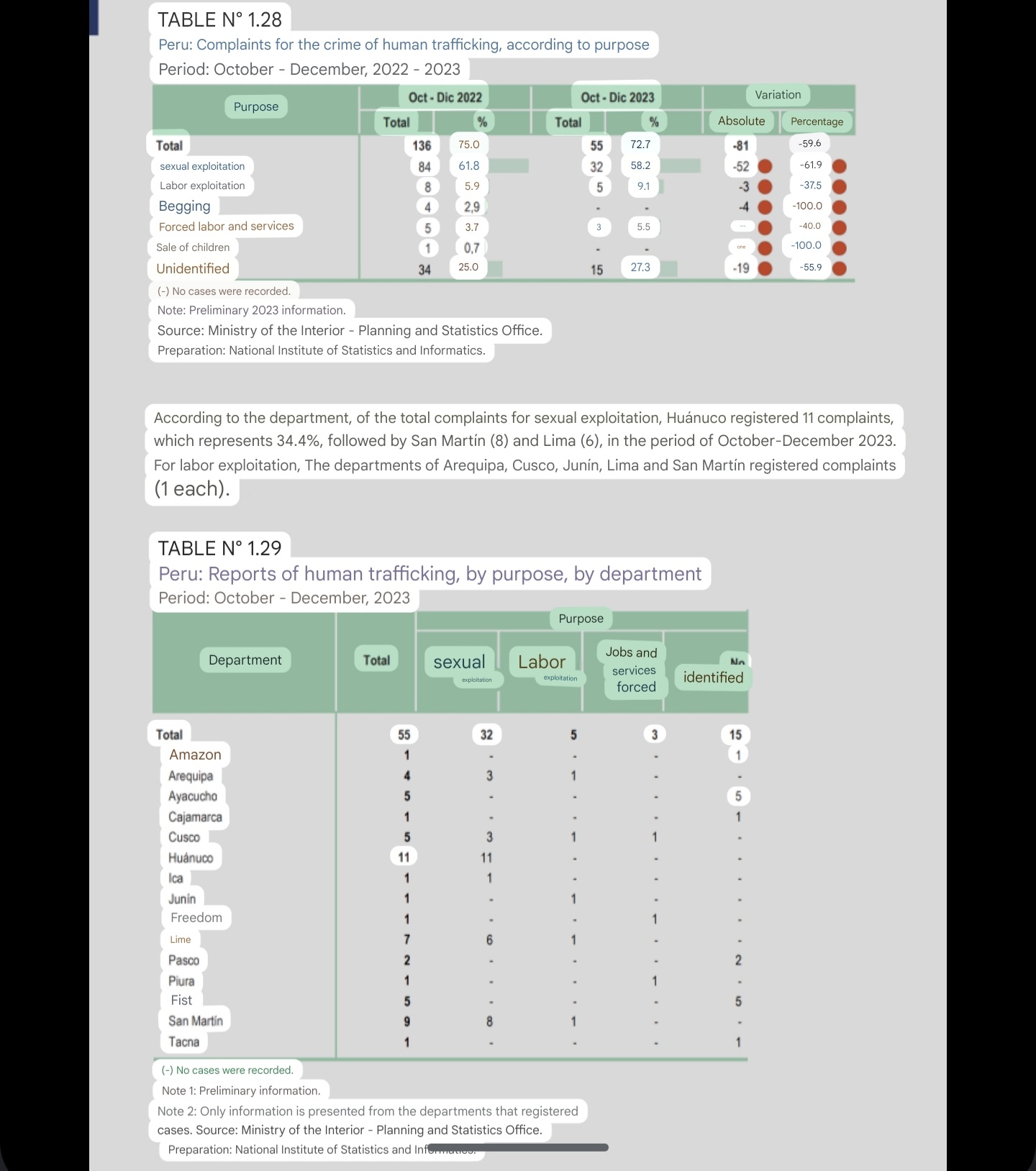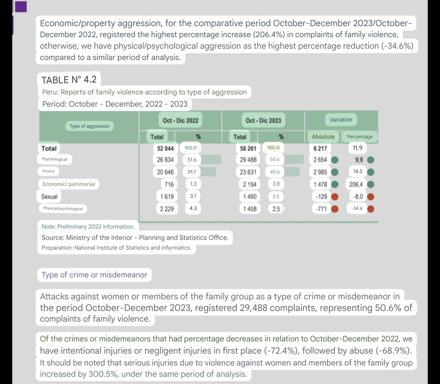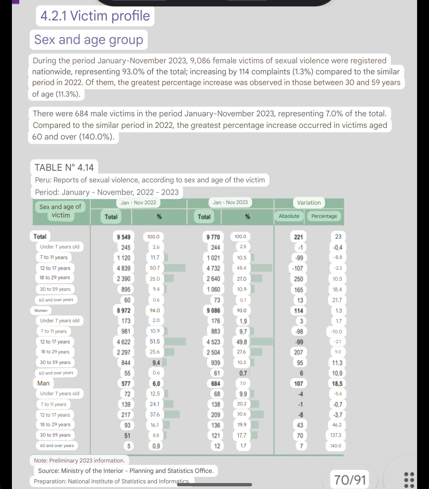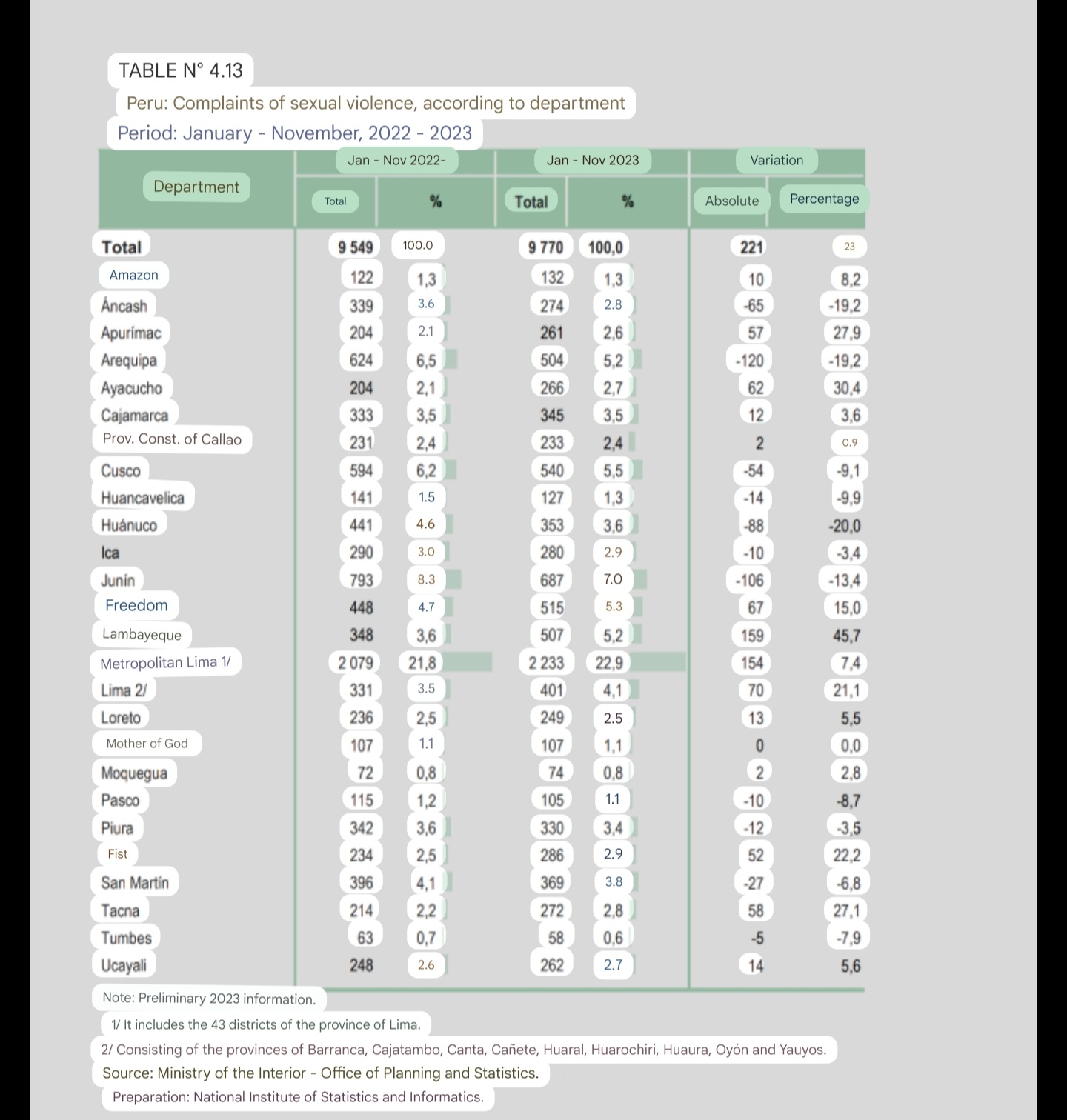 Below I will leave the statistics on family and sexual violence and white trafficking. Reference: https://m.inei.gob.pe/biblioteca-virtual/boletines/estadisticas-de-seguro-ciudadana/1/#lista