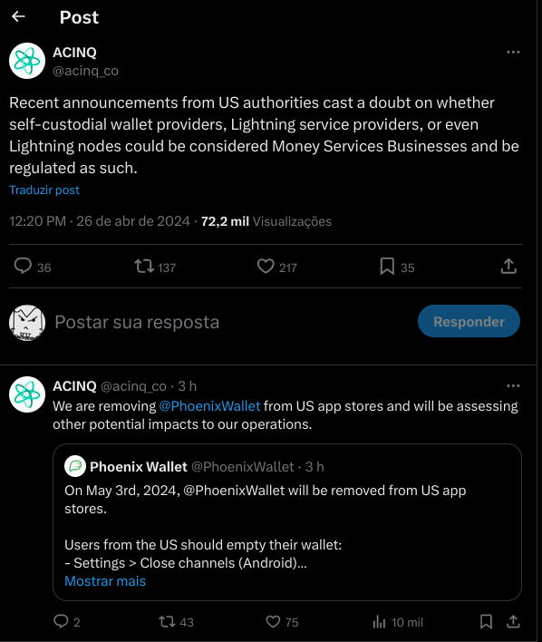 "Recent announcements from US authorities cast a doubt on whether self-custodial wallet providers, Lightning service providers, or even Lightning nodes could be considered Money Services Businesses and be regulated as such."