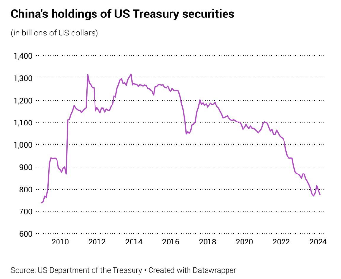 China is playing the long game, they are not taking chances selling US bonds but they let them expire and roll them out in gold instead. The Fed will have to print the difference like a banana republic