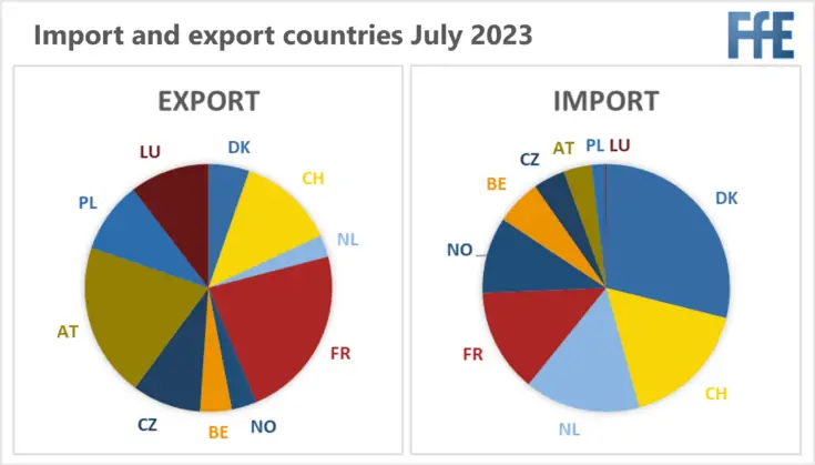 The European energy market is highly integrated, with France being a exporter of nuclear power. I couldn't find specific energy balance data between countries, but I did come across this recent article.