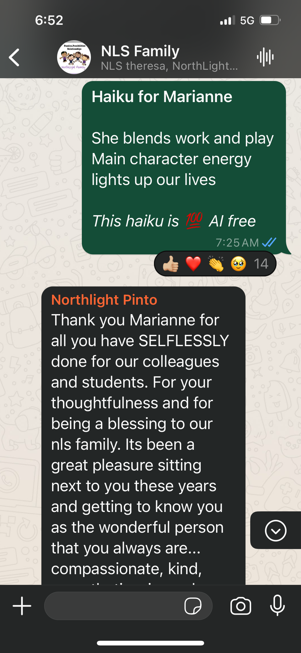 A colleague came over to ask why the last line only has four syllables. I told him that’s because I counted our as two syllables. Upon Googling, I realised that our is considered to have one syllable because there is no consonant between o and u. But some varieties of English pronounce it as Au-er, so I’m not exactly wrong. That’s why I love English. It can be prescriptive, but it is dynamic too.