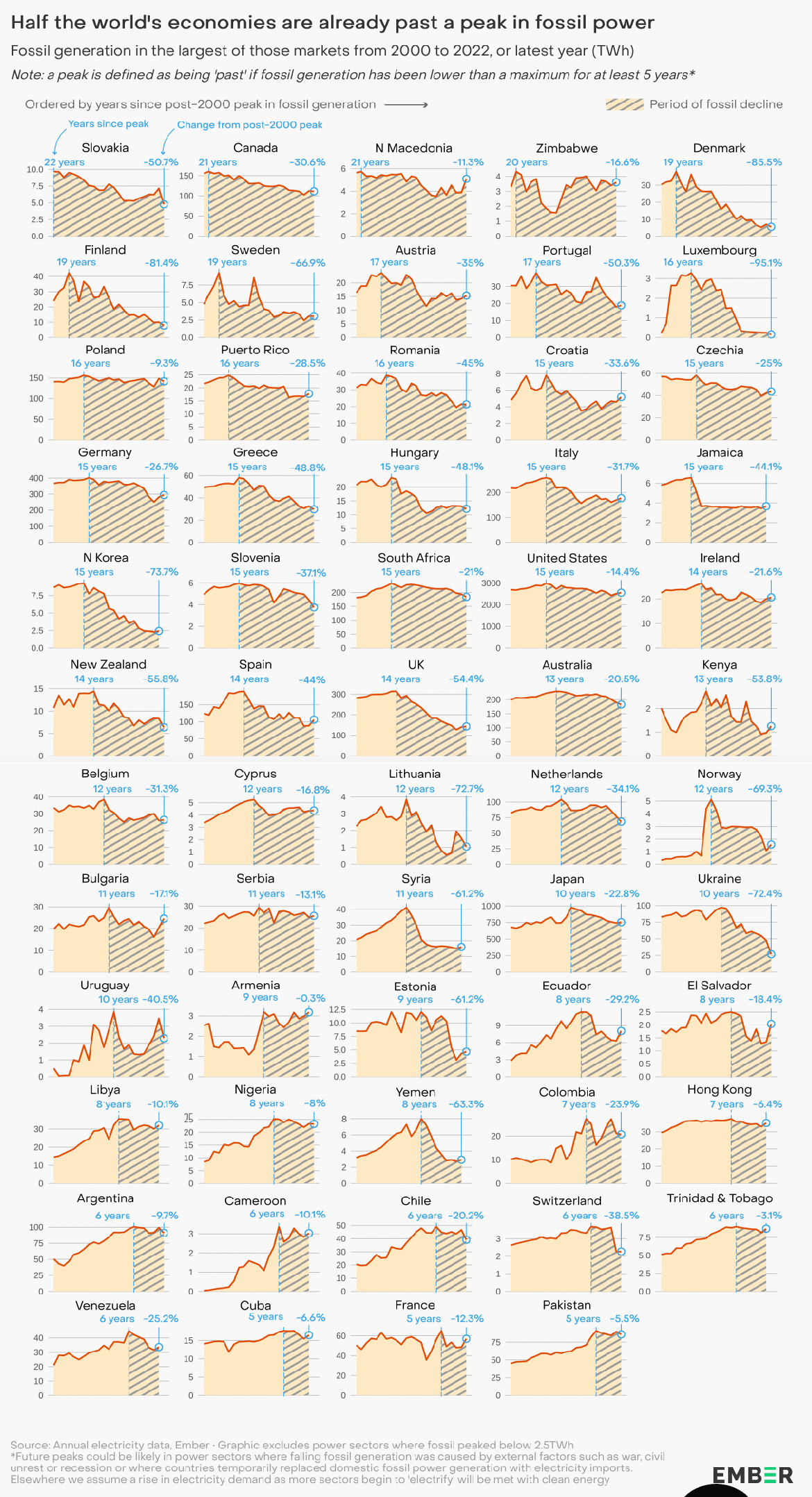 The EU is leading the way in displacing fossil fuels from the power sector, having cut fossil power by more than 30% in the last 15 years. Among EU countries, all but one (Latvia) have passed the milestone of five years since a peak in fossil power this millennium. Of the larger EU member states, Denmark and Finland have recorded the biggest declines this century, with fossil power generation in 2022 more than 80% below levels reached almost two decades ago.