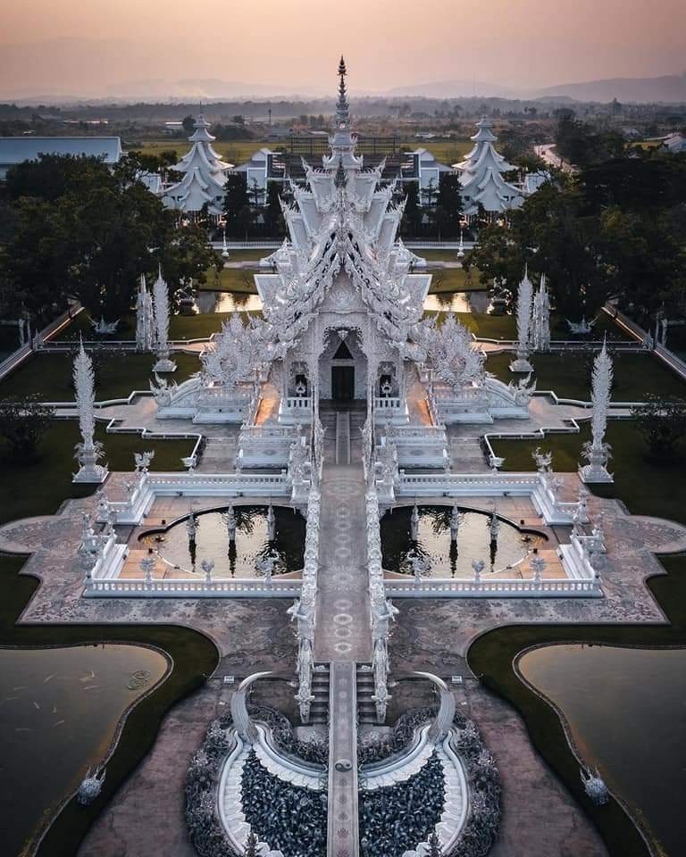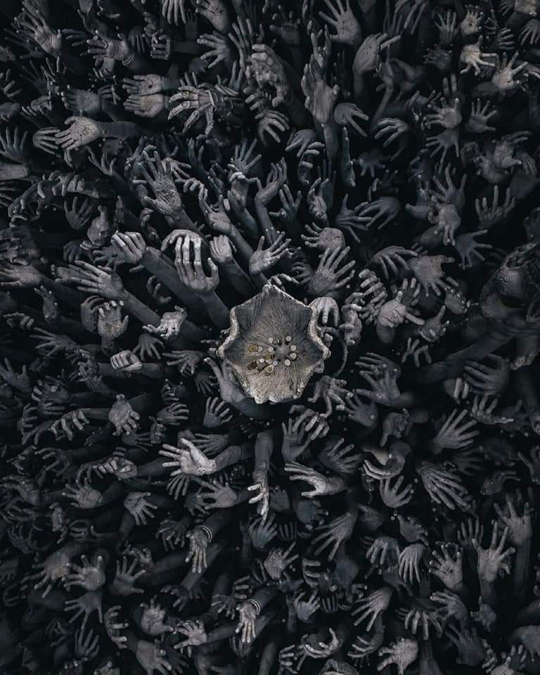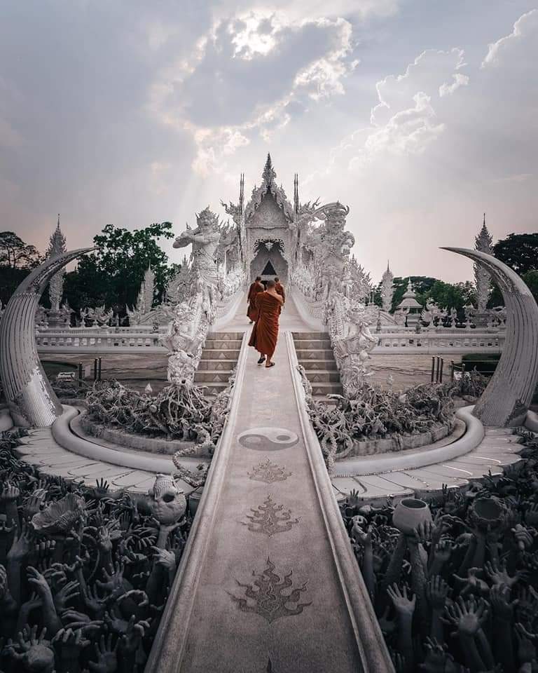 Thousands of hands reach out towards Wat Rong Khun, symbolizing unbridled desire. The bridge above proclaims that the path to happiness is to renounce temptation, greed and desire.