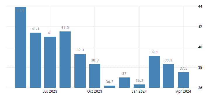 German construction PMI fell from 38.3 to 37.5 points in April and continues to point to a recession in the country.