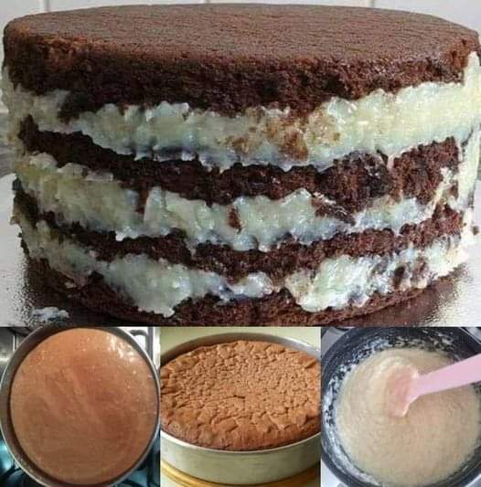 Beat the whole eggs with the sugar until they increase in volume. Dissolve the chocolate in the hot milk and, without stopping beating, add it to the eggs beaten with sugar. Beat for another 3 minutes. Using a spatula, gradually add the sifted wheat flour and yeast. Line the bottom of the pan with baking paper. You should not grease the sides of the pan, so the cake adheres and rises evenly. Bake at 180 degrees. To unmold, just use a knife and it comes out perfectly. Cut in half and stuff.
