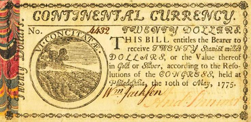 "the phrase “not worth a Continental” was in common use by the end of the war and Continental notes were only redeemed at 1 cent on the dollar 40 years after the Revolution."