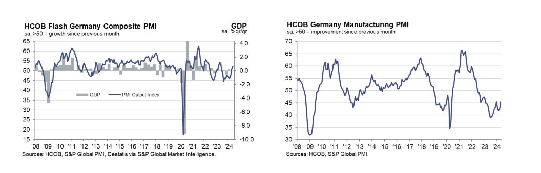 Germany's recent PMI figures paint a complicated picture of its economic health. The Composite PMI Output Index rose to 52.2 in May from 50.6 in April, marking a 12-month high. Similarly, the Services PMI Business Activity Index reached 53.9, an 11-month high, up from 53.2 in April. However, the manufacturing sector remains in contraction, with a PMI of 48.9, although this is an improvement from April's 45.4. Despite these mixed signals, there is no indication of a policy change. This suggests that while some sectors show signs of growth, the overall economic environment remains stagnant.