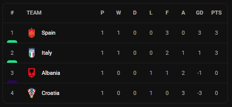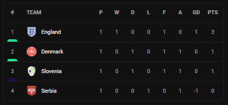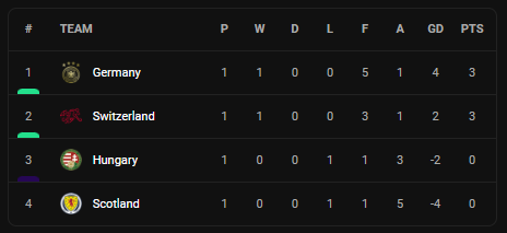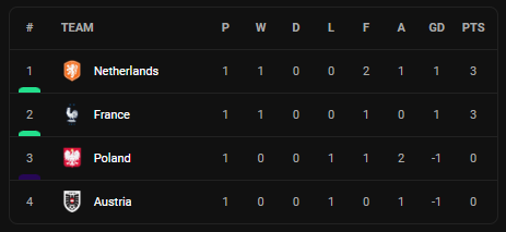 The first round of matches is now over, with 2 rounds to go before the group stage is complete. Then there are still the knockout stages. At the end of this round, the standings are as follows: