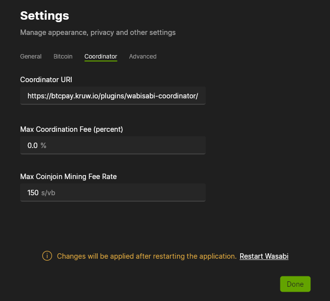 To participate using Wasabi Wallet, paste this coordinator info into the settings field and click "Restart Wasabi":