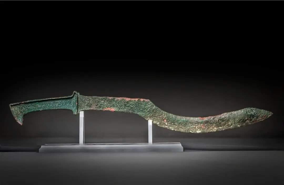 A Canaanite bronze sickle-shaped sword. The blade of the sword curves for two-thirds of its length, but is straight at the bottom. The handle has raised edges and ends in a “comma” to ensure a good grip.
