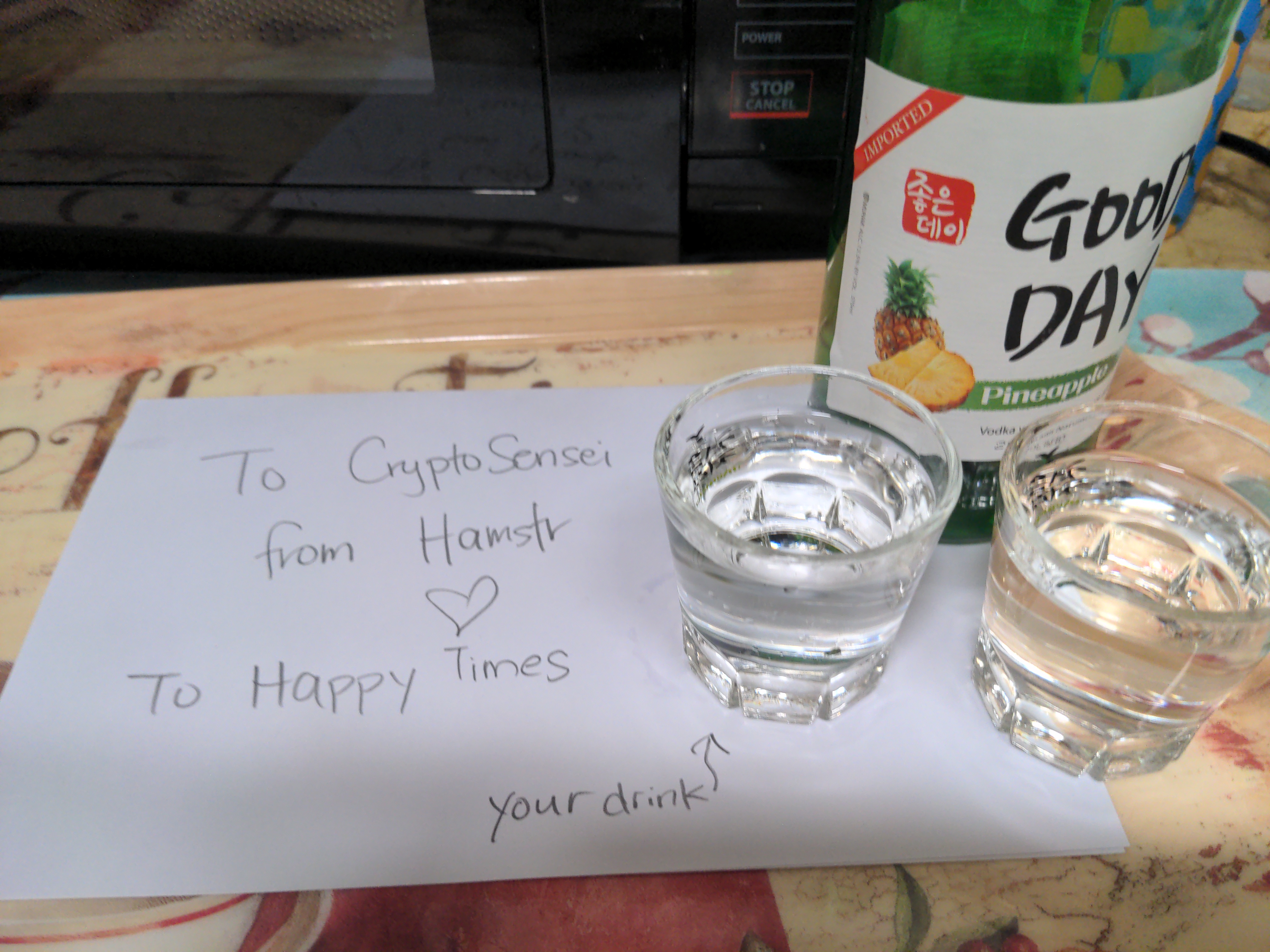 Toast! To send you more sake but for now settle for soju <3 hamstr