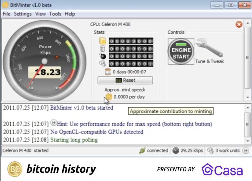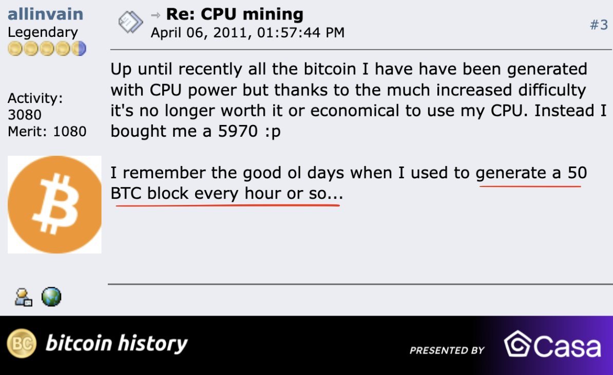 Armed with just his laptop, he was mining blocks giving 50 Bitcoins every hour.