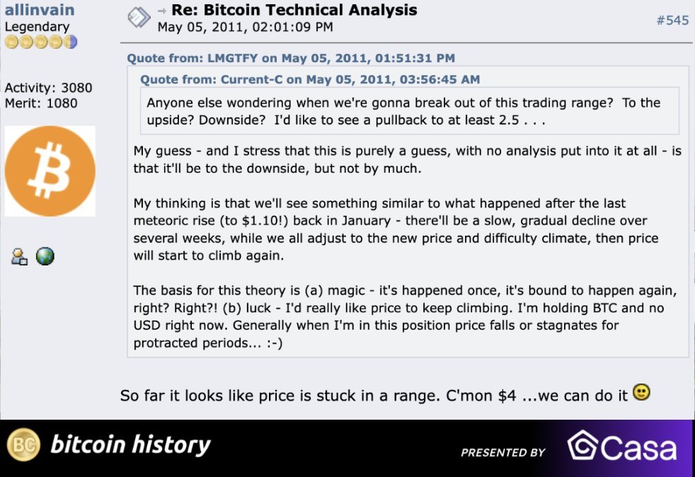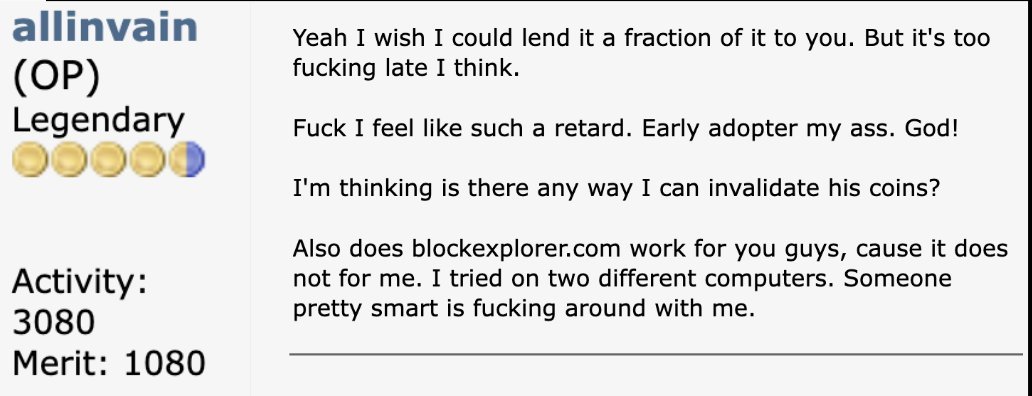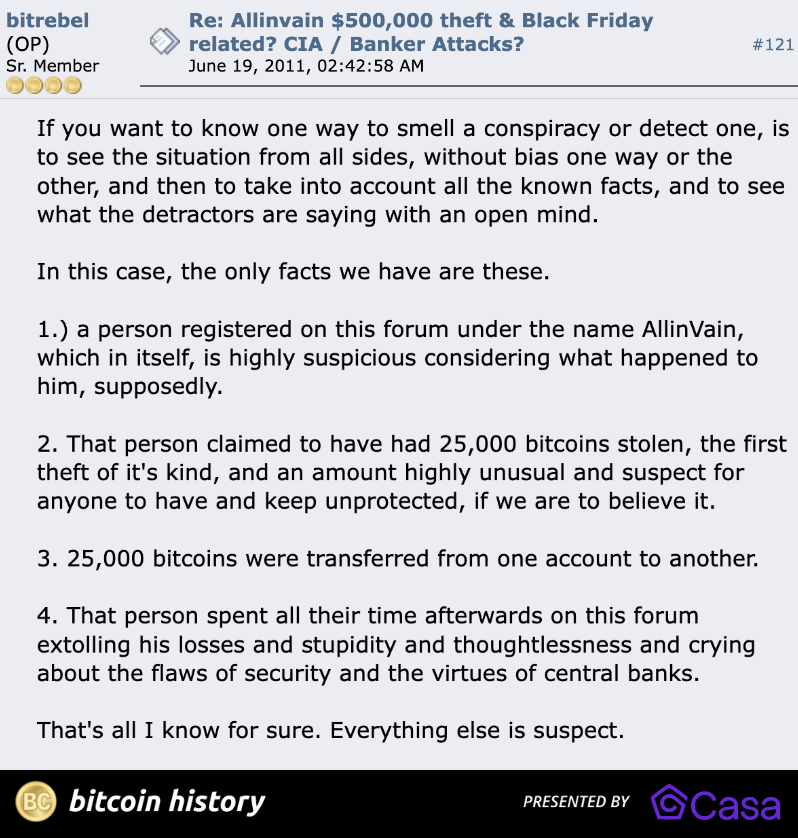 Soon, ALLINVAIN became a Bitcoin whale with ownership of over 25,000 Bitcoins.He welcomed the price surge in early 2011, when it peaked at a high of $30.