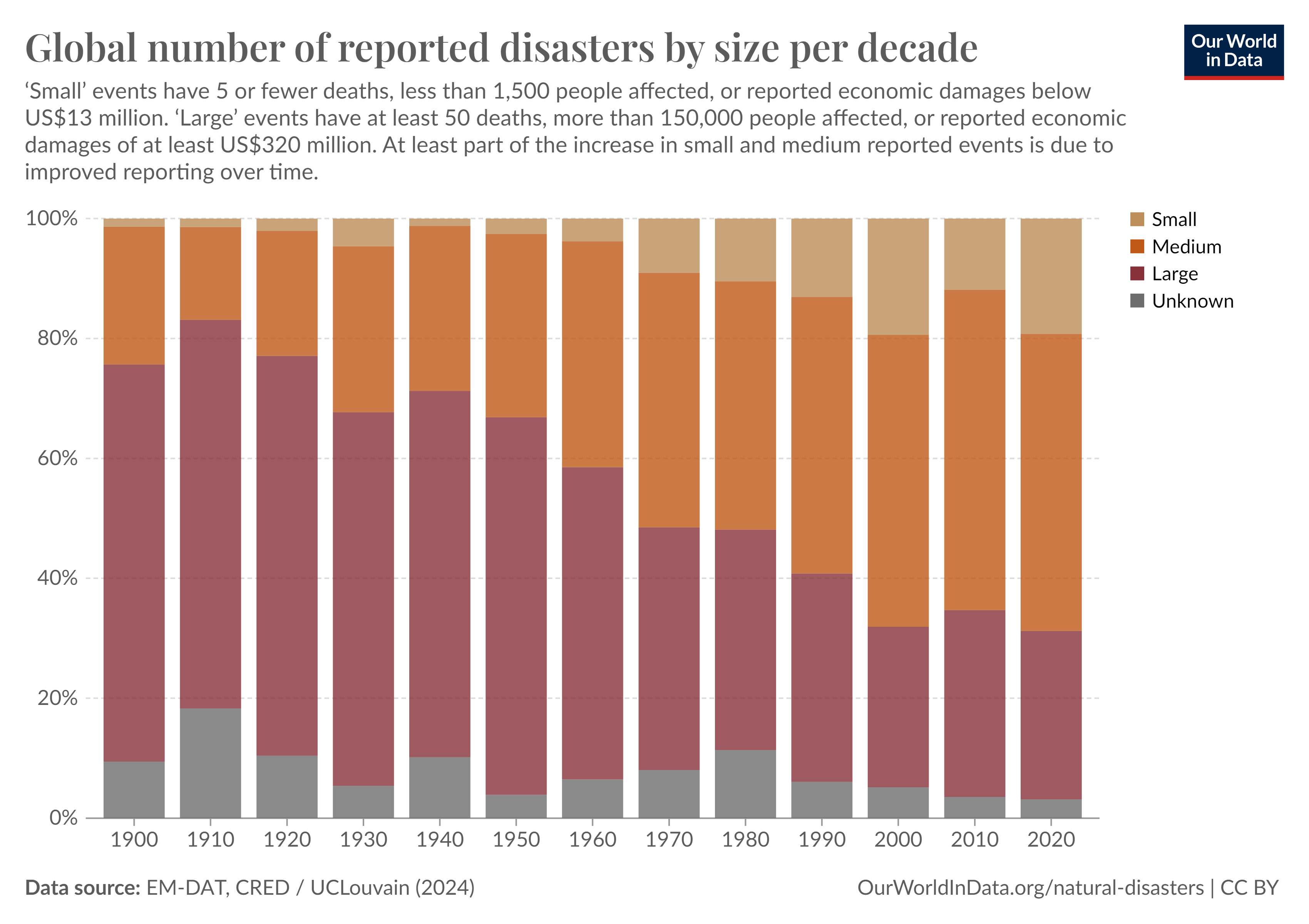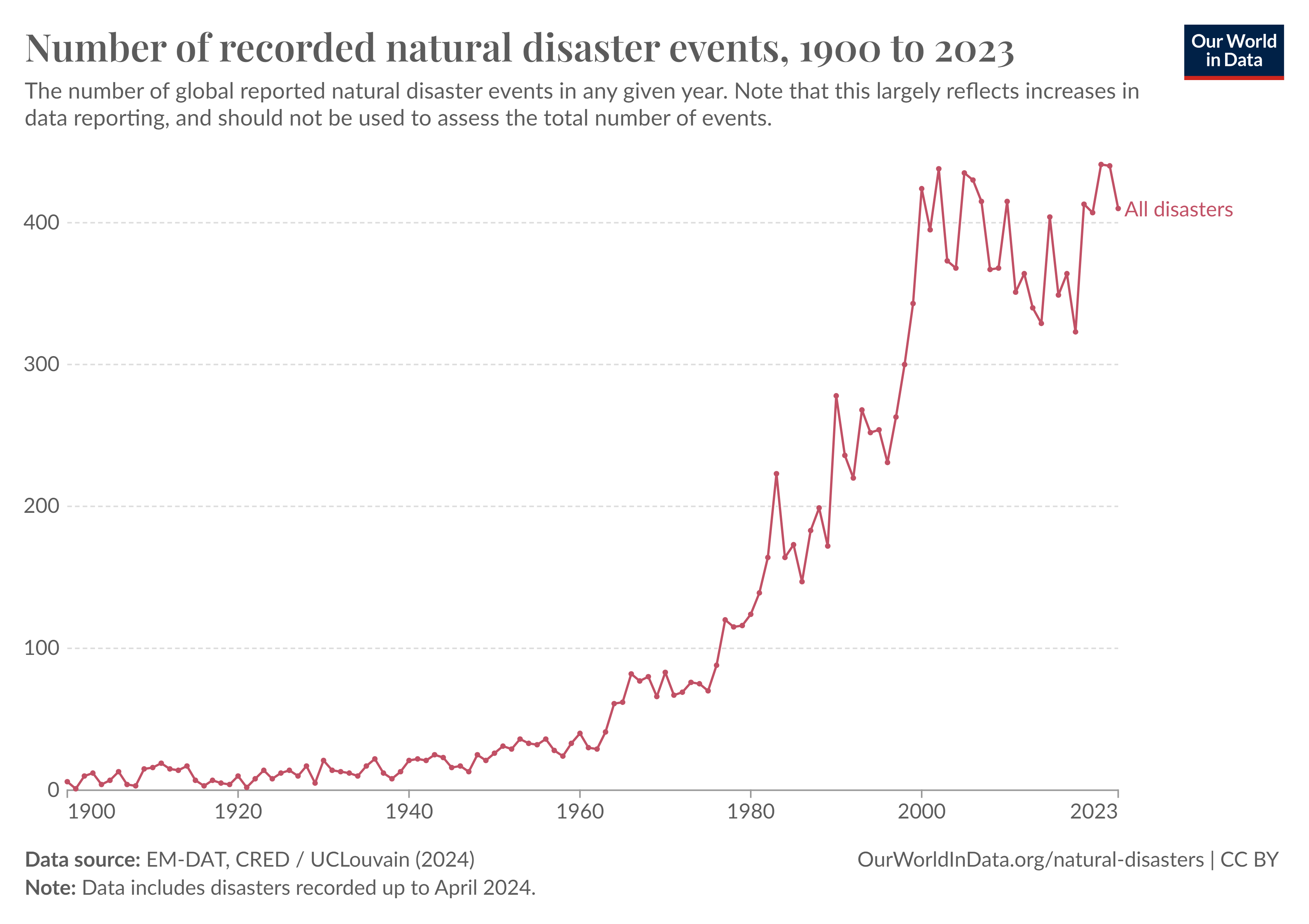 In this article, we explore several of these biases, which can lead to incorrect conclusions when analyzing historical trends.The increase in the number of disasters is partly a result of reporting biasThe increase in the number of disasters is partly a result of reporting bias