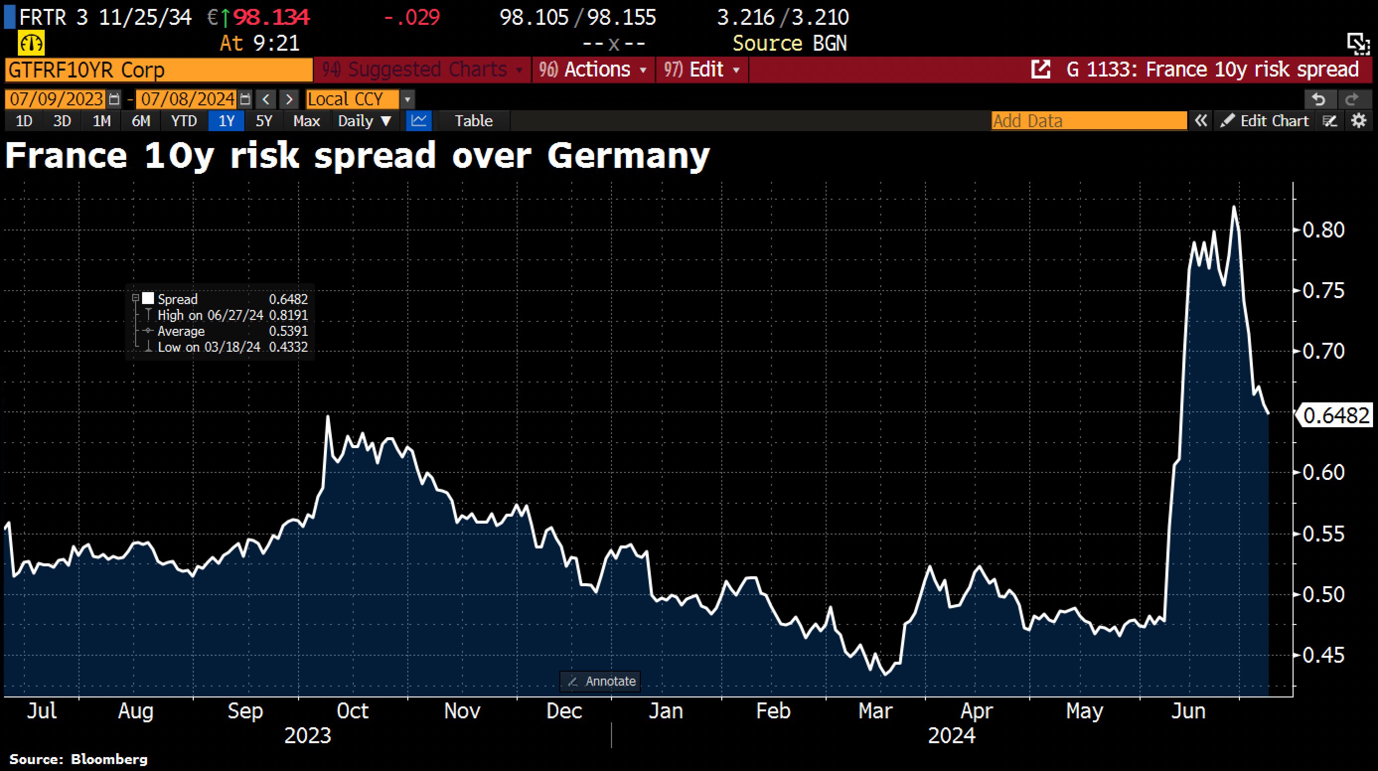 I don't think this graph is the best way to understand the French debt market. It just compares French and German debt, right? Shouldn't we look at the 10-year bond yields instead?