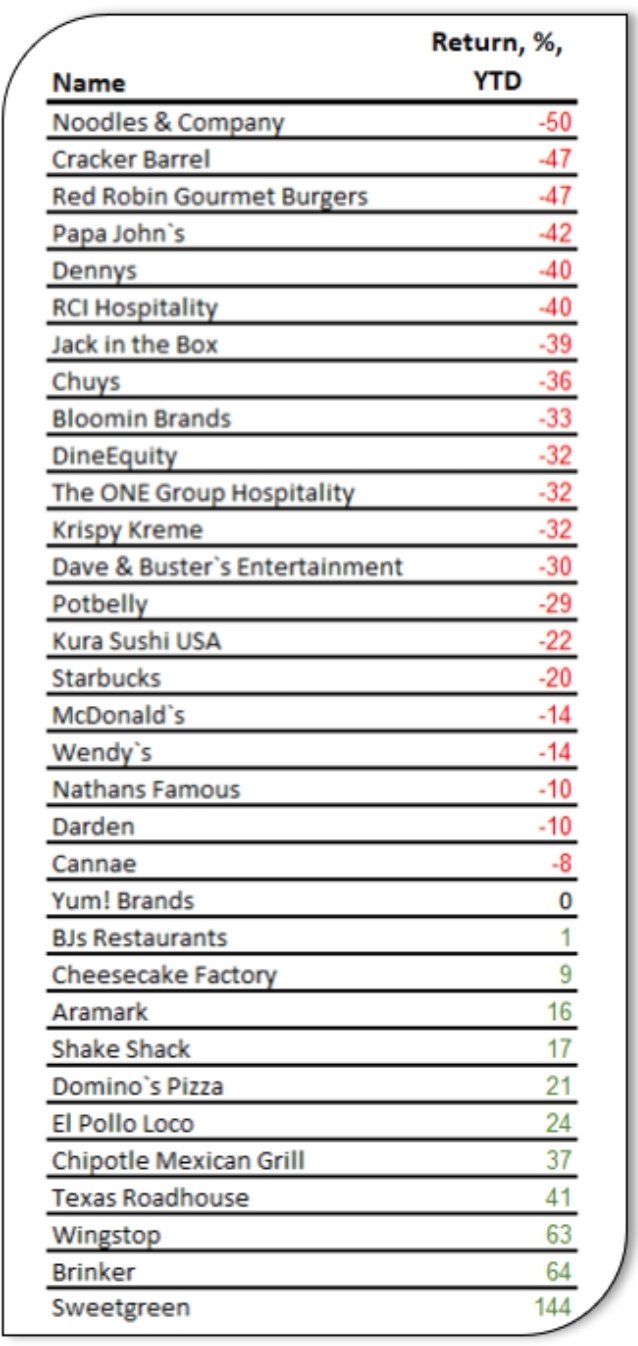 Casual dining restaurant stocks are going down the drain. The stock market is anticipating the weak consumer, who has significantly less money to spend after years of inflation. I think we're seeing a comeback of home cooking!