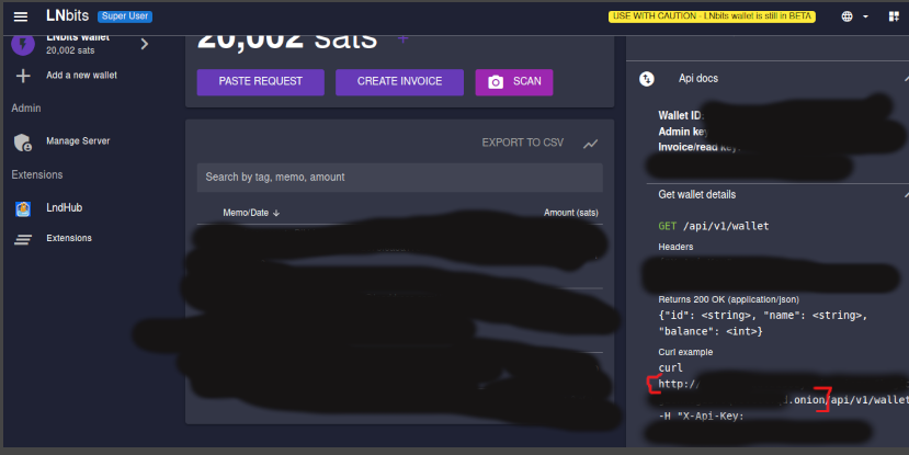 - Now, we need to grab the info needed for the 'Host Protocol + IP or Domain + Port' field on the lnaddress.com page. On the lnbits page, expand the 'Api Docs' field, and the 'Get Wallet Details' field found on the right hand side menu. In this 'Get Wallet Details' section, you will want to copy some of the URL found in the 'curl example' section. Copy 'http://xxxxxx.onion' (don't copy any more!), and paste this into the 'Host (Protocol + IP or Domain + Port' field found on the lnaddress.com page.