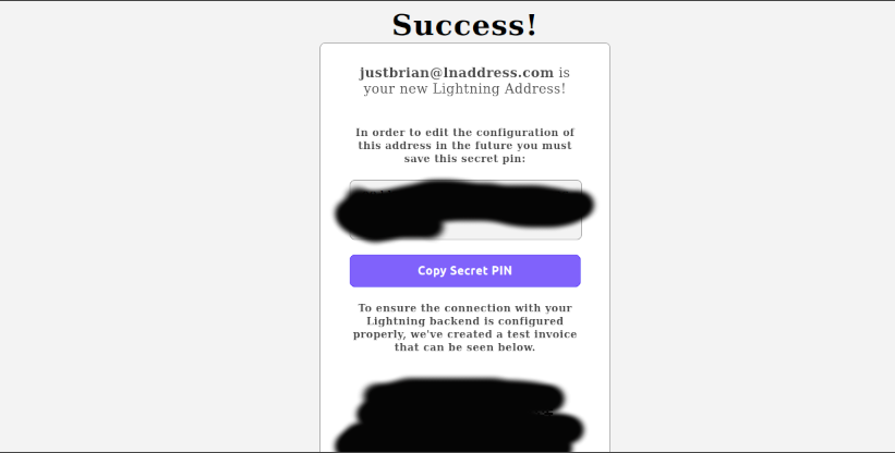 You will want to save this secret PIN in case you need to update info in your ln address. You'll also find a test lightning invoice of 1 sat. Using a wallet not connected to the node we connected to our new ln address, you can test the ln address out by paying the 1 sat test invoice.