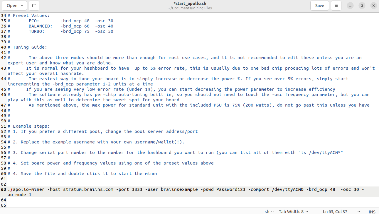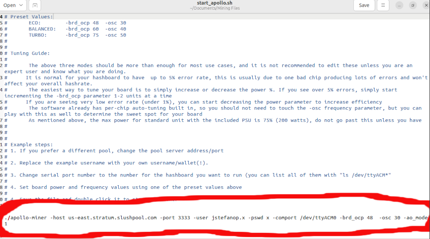 - From the files that you downloaded in step 3, we are going to double-click on 'start_apollo.sh' and open it up in Text Editor. The first 60 lines or so are explanations on how to prepare this script for your use. However, I am going to run you through all the options to update, so you shouldn't need to read the description. Instead, we are going to focus on the text in black font at the bottom of the file: