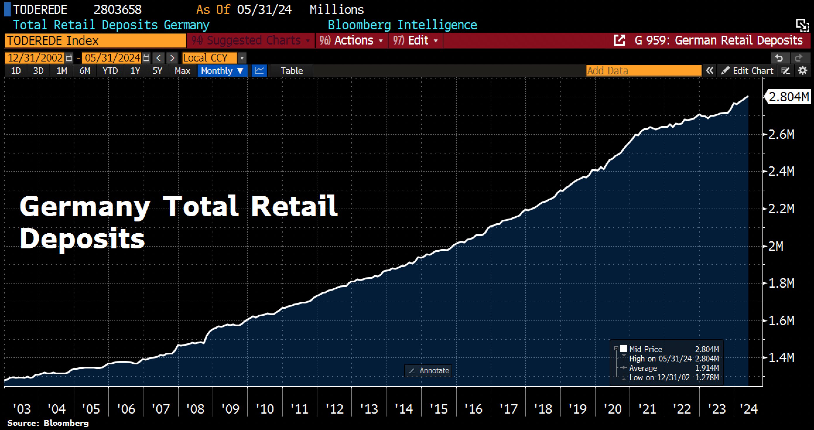 In May, German retail deposits soared to an all-time high of €2.8 trillion. With a third of these assets sitting in non-interest-bearing current accounts, many Germans are forgoing potential investment returns.