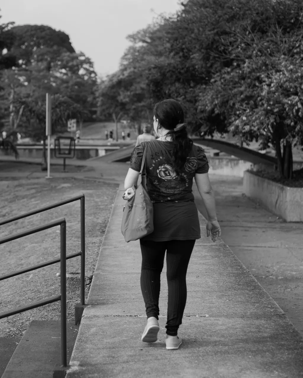 As I was walking through the park I came across this very interesting scene; people usually walk their dogs here BUT this lady was carrying her dog inside her bag, I found it very funny haha