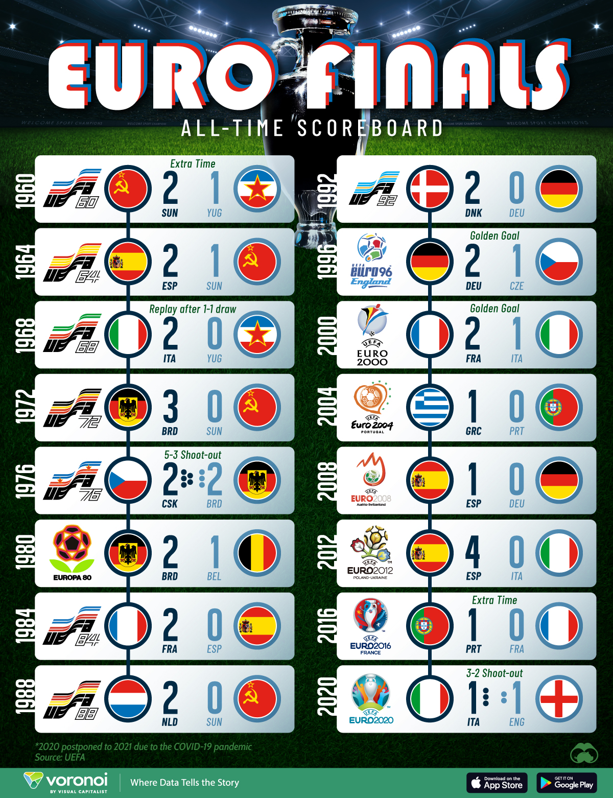 Held every four years, the Euros is among the most-watched football tournaments in the world after the FIFA World Cup, with the 2020 Euros (postponed to 2021 due to the COVID-19 pandemic) drawing a live match cumulative audience of 5.2 billion.