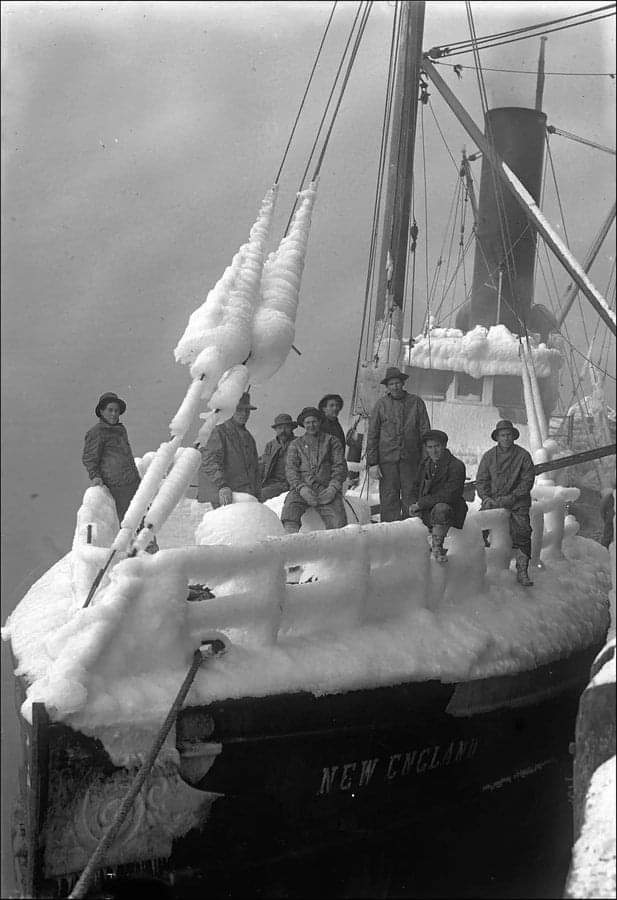 Fishing boat “New England” covered in ice, British Columbia, 1916