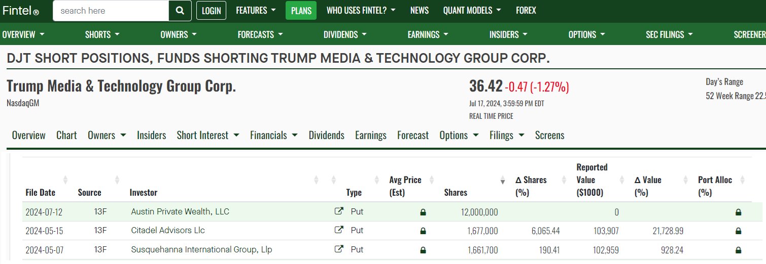 Here's the relevant data from fintel.io, showing the astonishingly huge short position ("put") filed on July 12th by Austin Private Wealth, LLC against Trump Media & Technology Group, Corp, for an astonishing 12,000,000 shares. This would have generated a windfall of profits if Trump had been shot and killed a day later. You can look this up yourself: